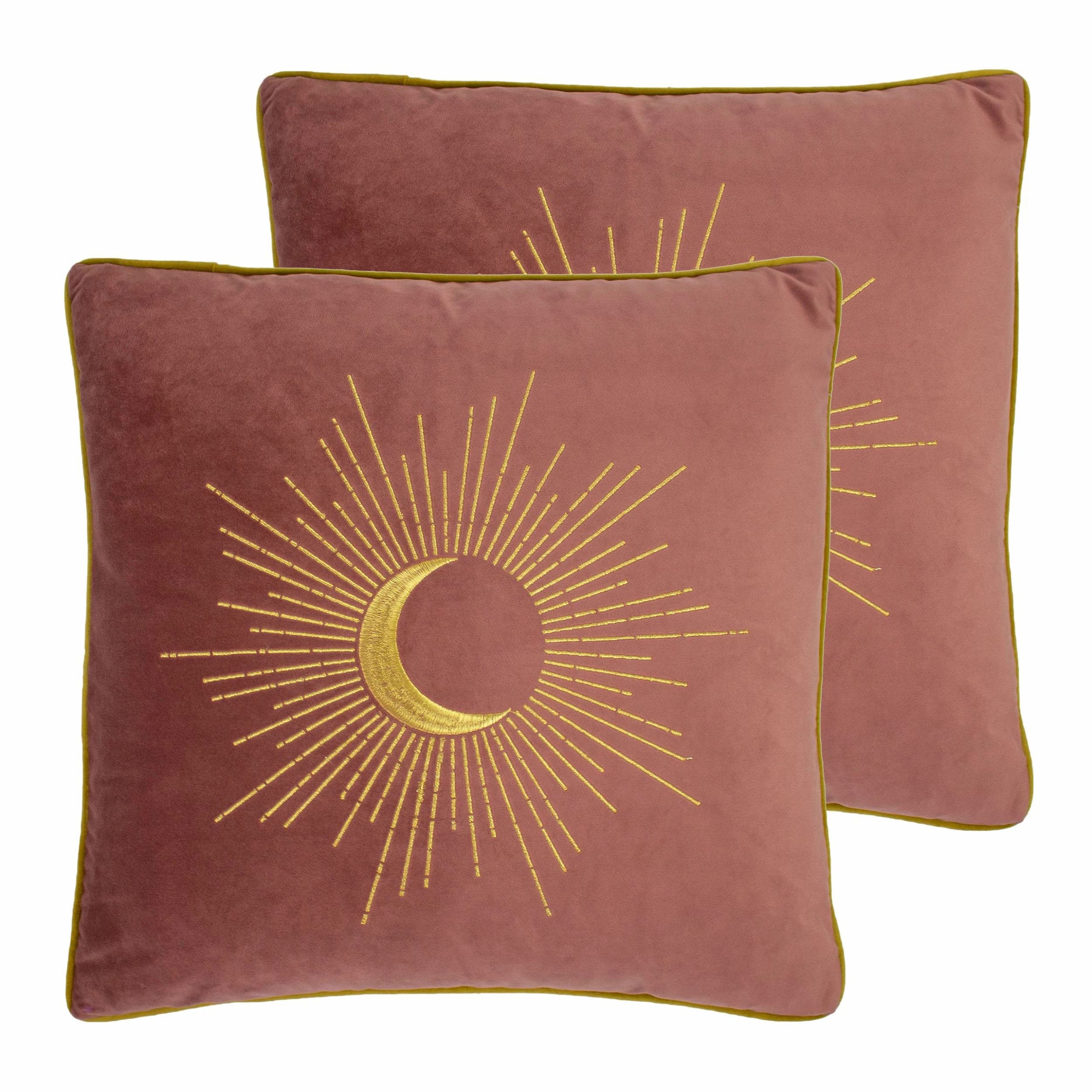 Add chic style to your interior with this gold embroidered soft velvet cushion. With a beautifully adorned design of an eclipse setting paired with its contrast-coloured velvet piped edges – this will sit perfectly upon any chair or bed.
