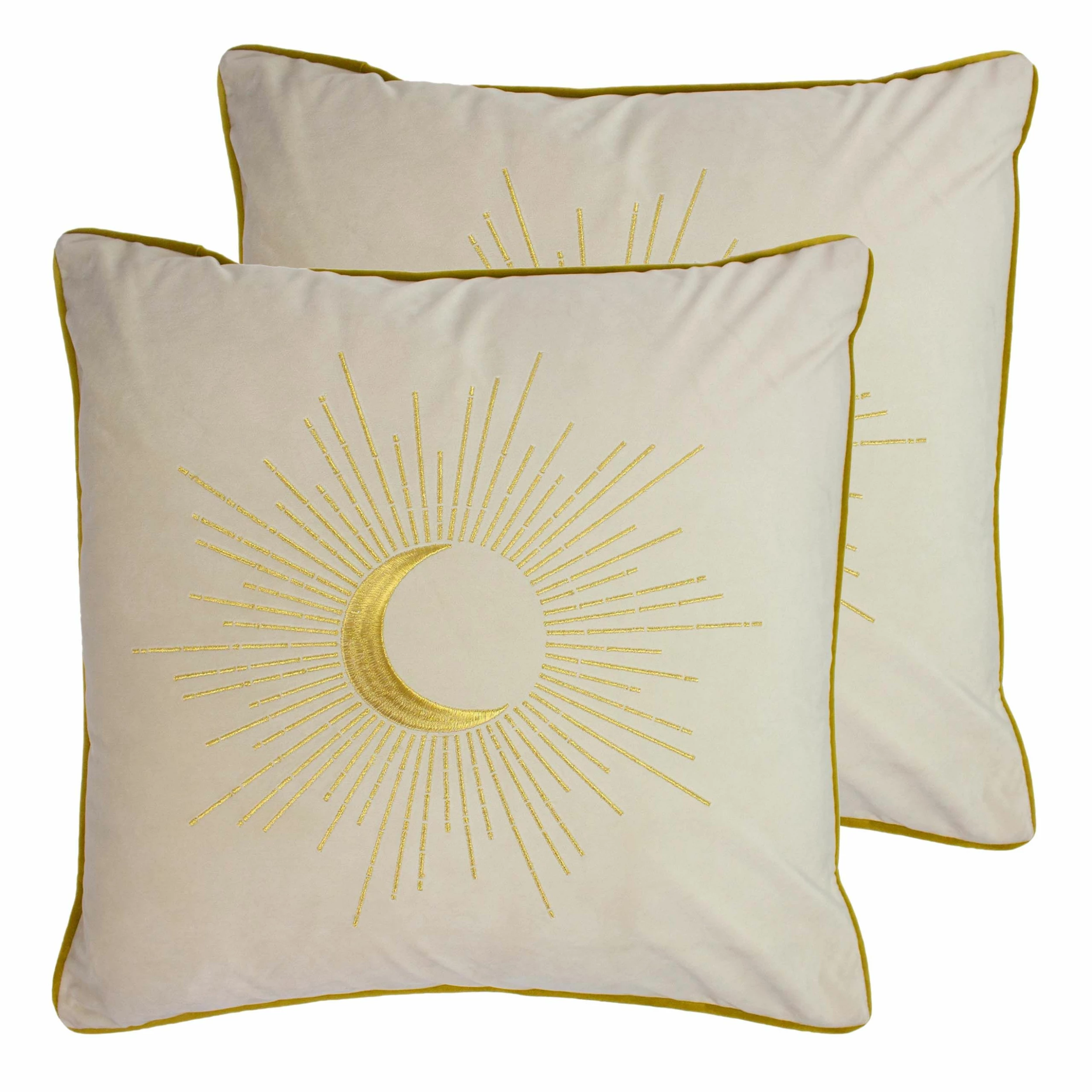 Add chic style to your interior with these gold embroidered soft velvet cushions. With a beautifully adorned design of an eclipse setting paired with its contrast-coloured velvet piped edges – these will sit perfectly upon any chair or bed.
