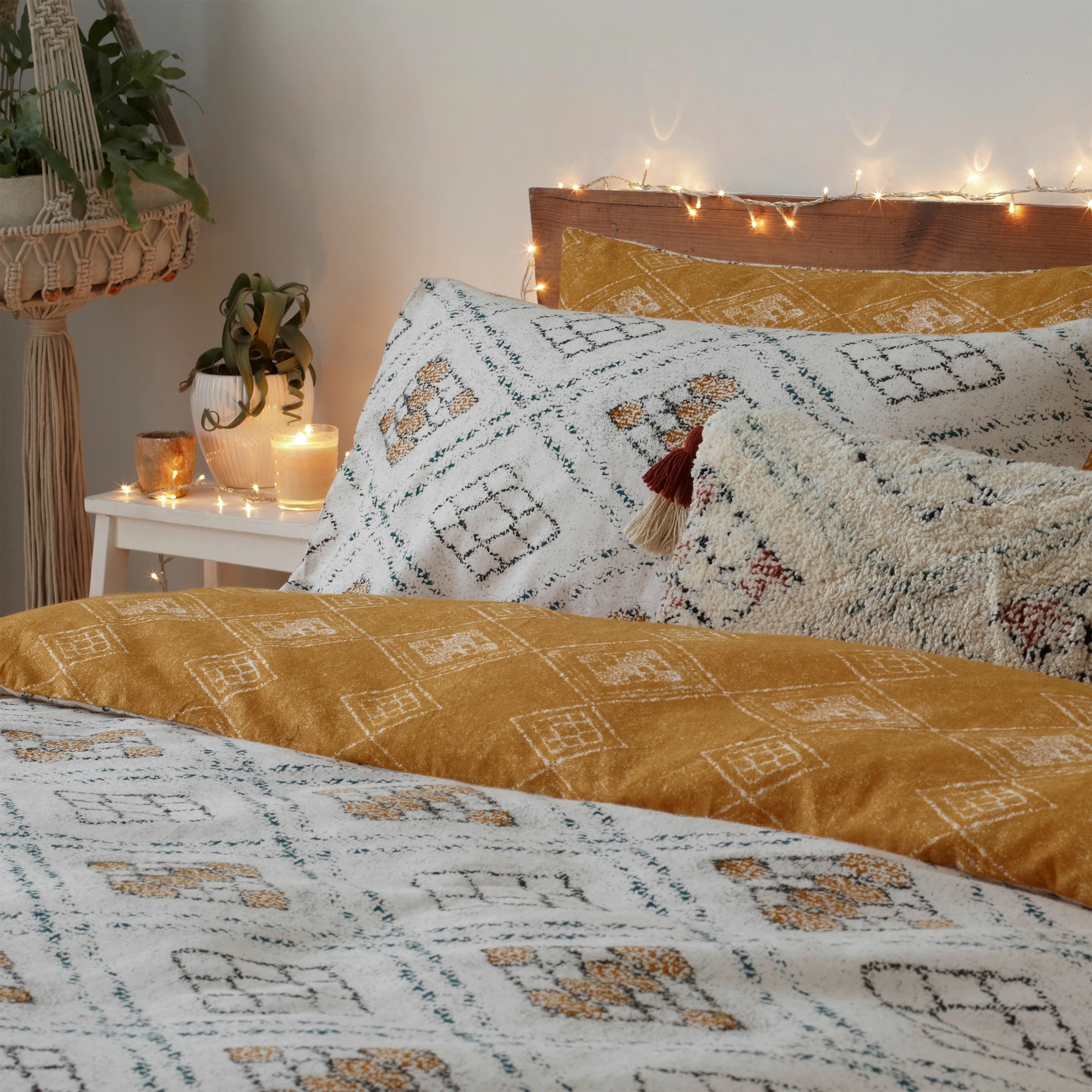 The Atlas Duvet Cover and Pillow Case Set features a global textile inspired print. Whilst the main design is neutral and calming, the reverse design features a coordinating design in warm ochre. The brushed cotton finish adds a snug element to ths design, making it tricky for you to get out of bed on a morning! Complete with a clear button closure and easy care properties, this design will give you all-year round summer feels.