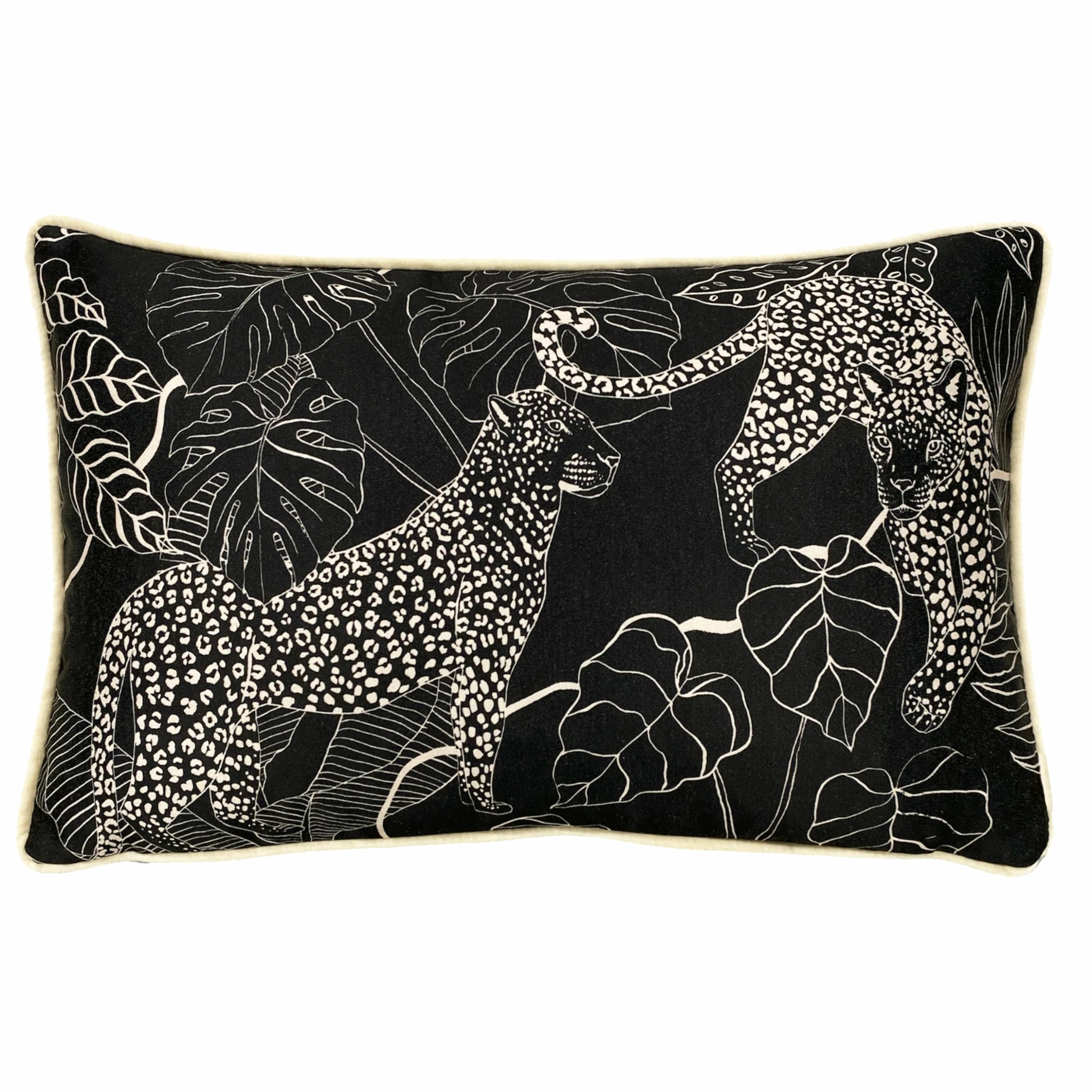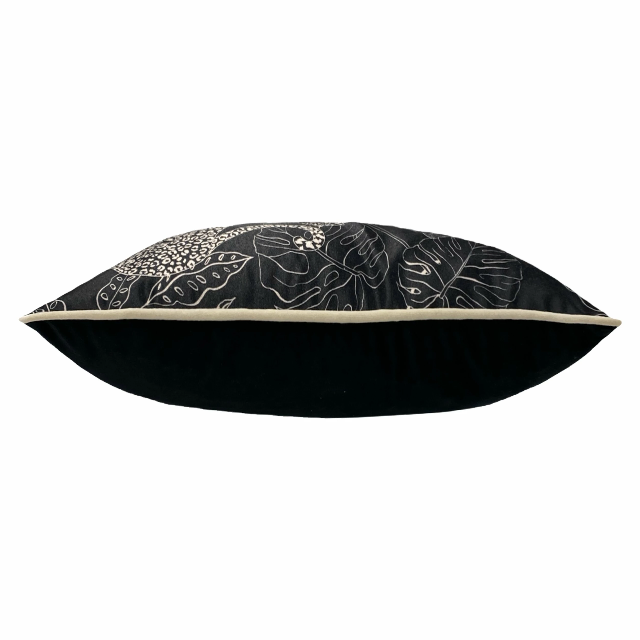 Hidden in the depths of this hot tropical jungle you see two roaming Leopards. These delicate paintings paired with the jet black base give this cushion a contemporary twist. Finished off with a black velvet reverse and a contrasting piped edge. A romantic finishing touch to any neutral décor. Coordinate with the Aurora Duvet Cover Set.