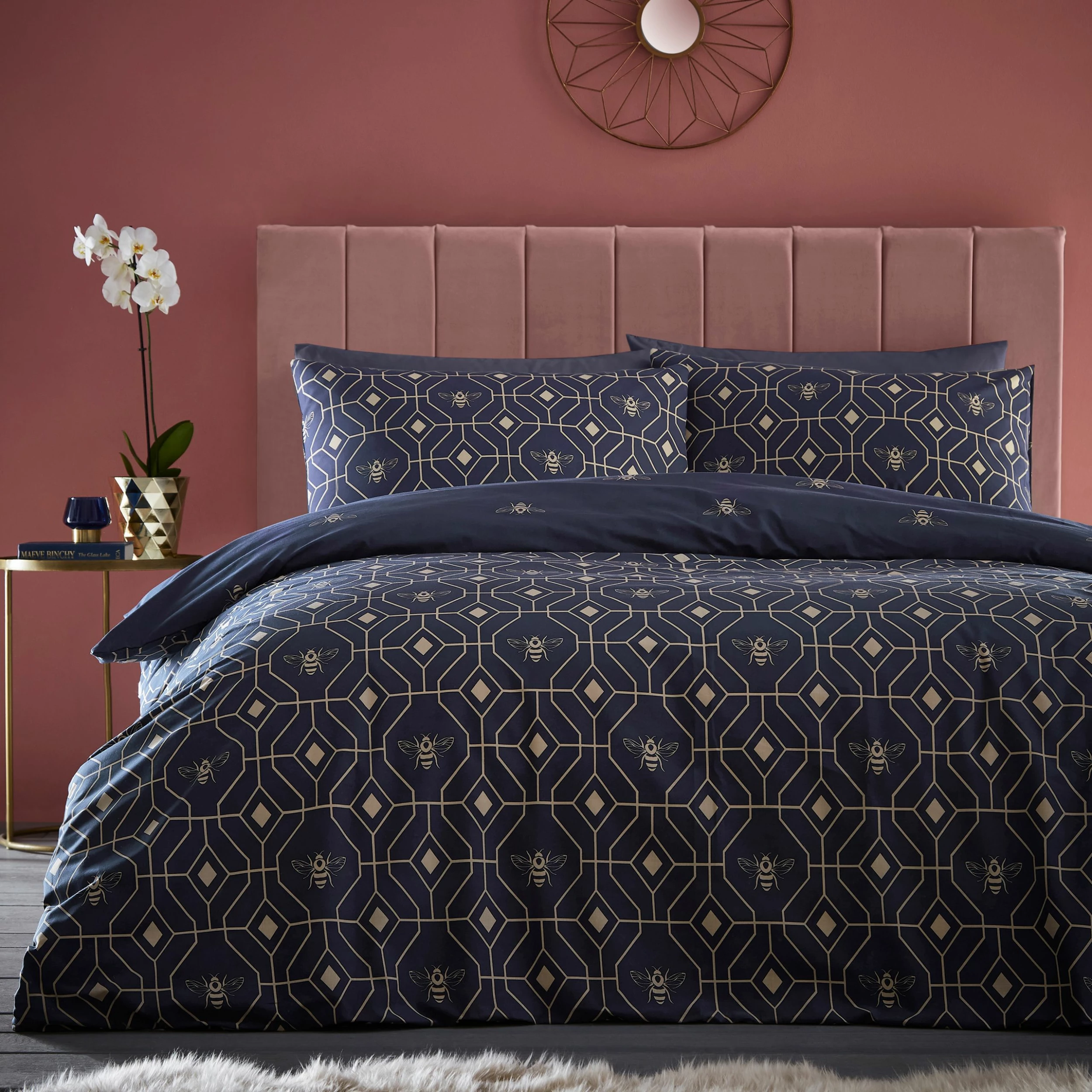 Make your boudoir buzz with a bee deco duvet cover set. The geometric honeycomb design creates a busy bee pattern that will make your bedroom buzz. The reverse features a coordinating bee design, for a softer look.