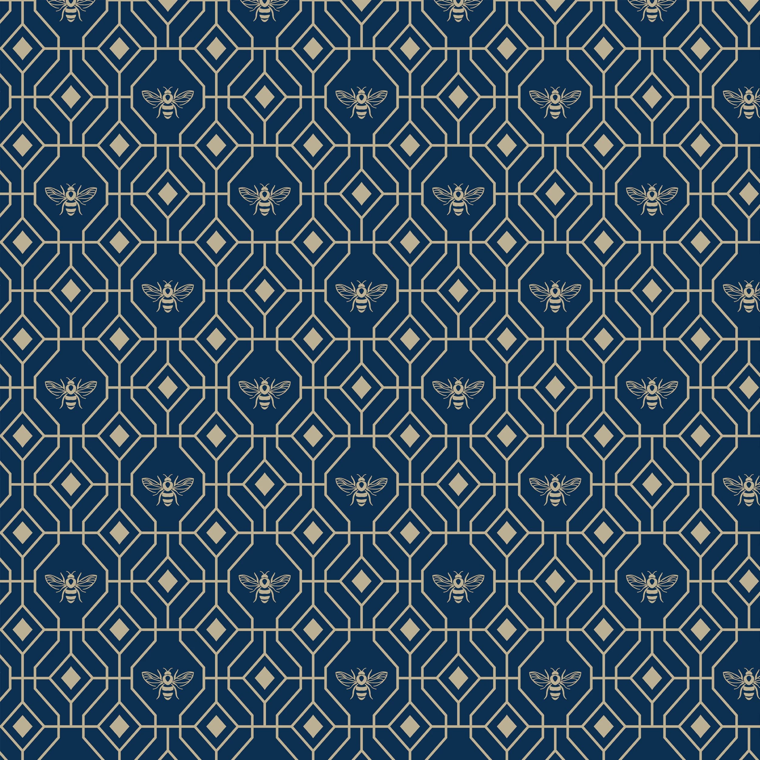 Make your boudoir buzz with the Bee Deco wallpaper featuring a honeycomb inspired geometric design completed with buzzing bumble bees. A rich dark blue hue sits behind metallic gold foil, bringing a contemporary and moody colour scheme into your home. This wallpaper is a paste the wall application; simply paste the wall, hang your paper, and leave to dry. Each roll is 10m long and 52cm wide. Pattern repeat: 53cm Straight match. Our Bee Deco wallpaper can be used to paper the whole room or to create an eye-catching feature wall. This wallpaper is also wipeable so that any light marks can be dabbed away.