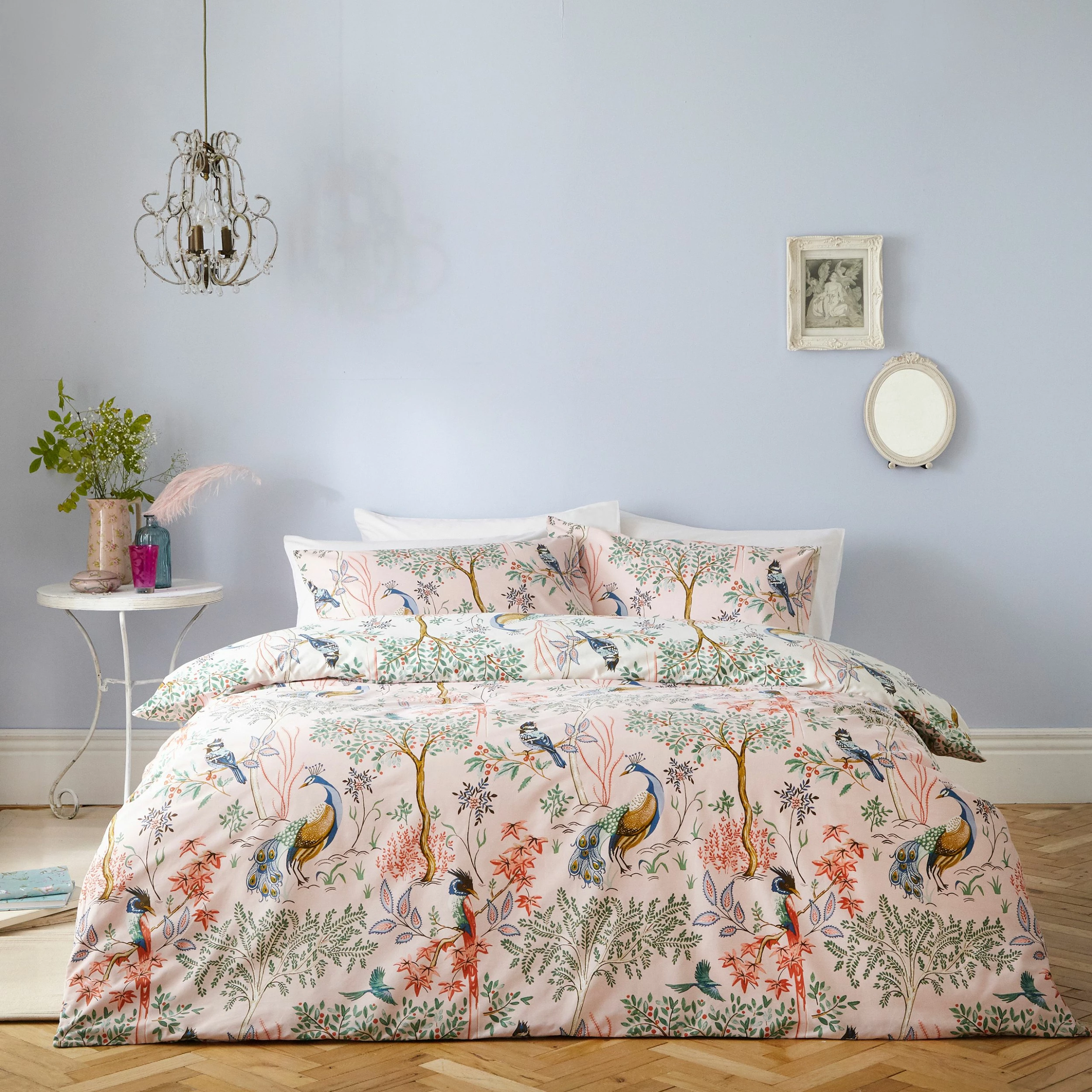 Stroll through the gardens of paradise with majestic peacocks walking through flowers of Eden. Add a touch of spring to your bedroom with this exclusive Birds of Paradise bedding.