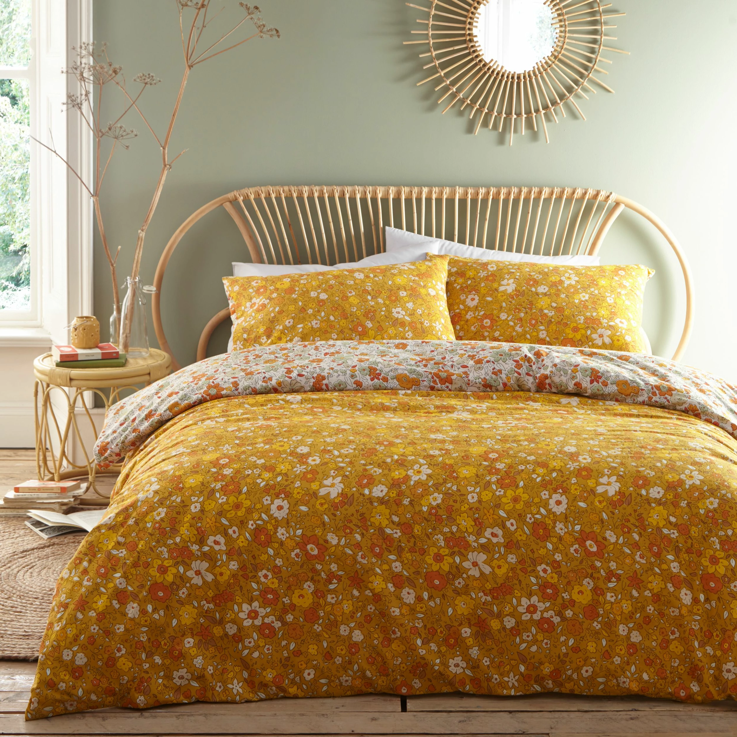 Add a burst of botanic to your room with this ditsy floral duvet cover and pillow case set, featuring an array of vibrant flowers. The floral print covers the reverse on an ochre base so you can switch the look when you need to.