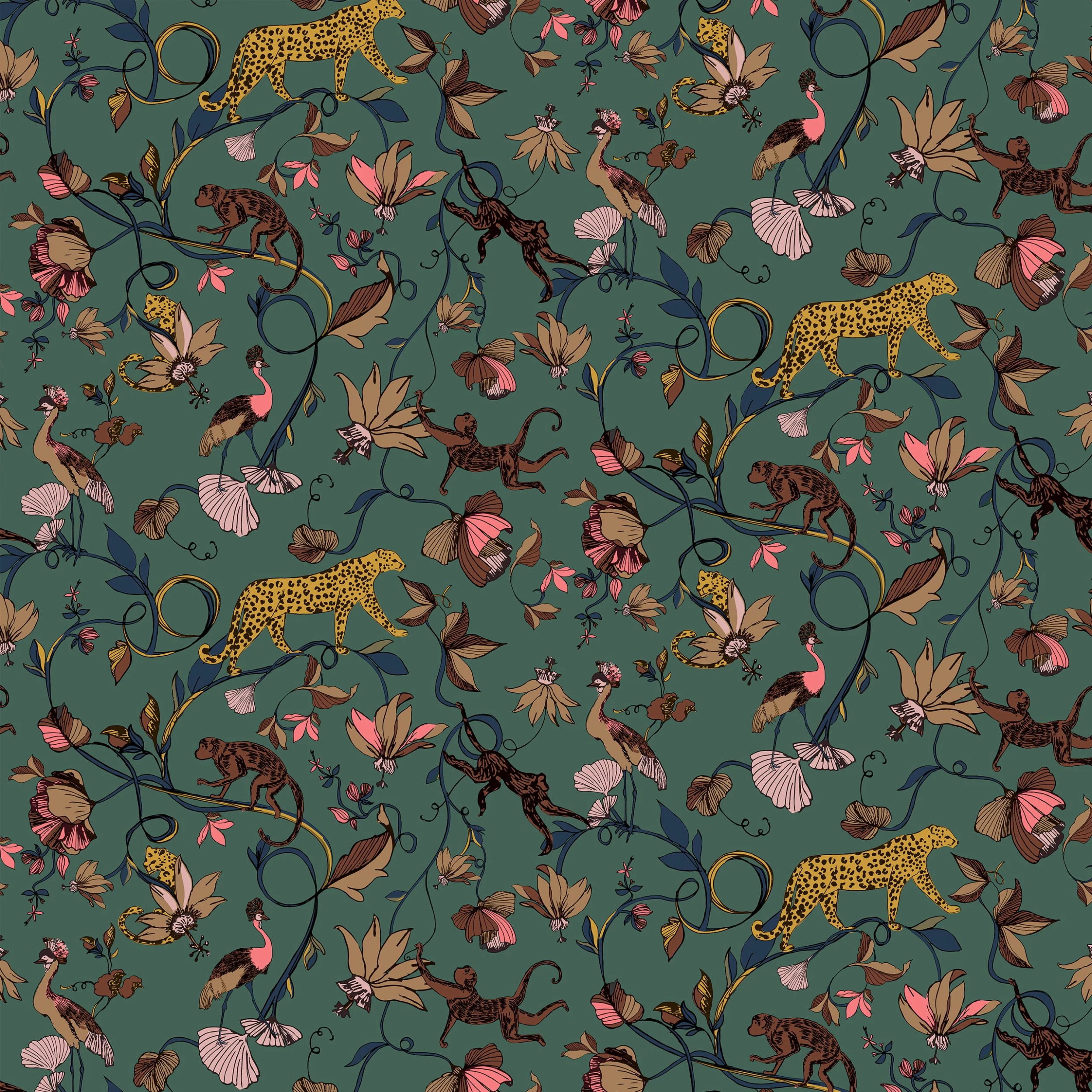 Add some wildlife to your home with the Wildlings wallpaper featuring a lively monkeys’ swinging from vines, exotic birds, and cheetahs in tropical foliage. Tropical foliage and striking florals on the rich juniper green background allow you to get lost in a midnight paradise in the comfort of your own home. This wallpaper is a paste the wall application; simply paste the wall, hang your paper, and leave to dry. Each roll is 10m long and 52cm wide. Pattern repeat: 26.5cm Half Drop. Our Wildlings wallpaper can be used to paper the whole room or to create an eye-catching feature wall. This wallpaper is also wipeable so that any light marks can be dabbed away.