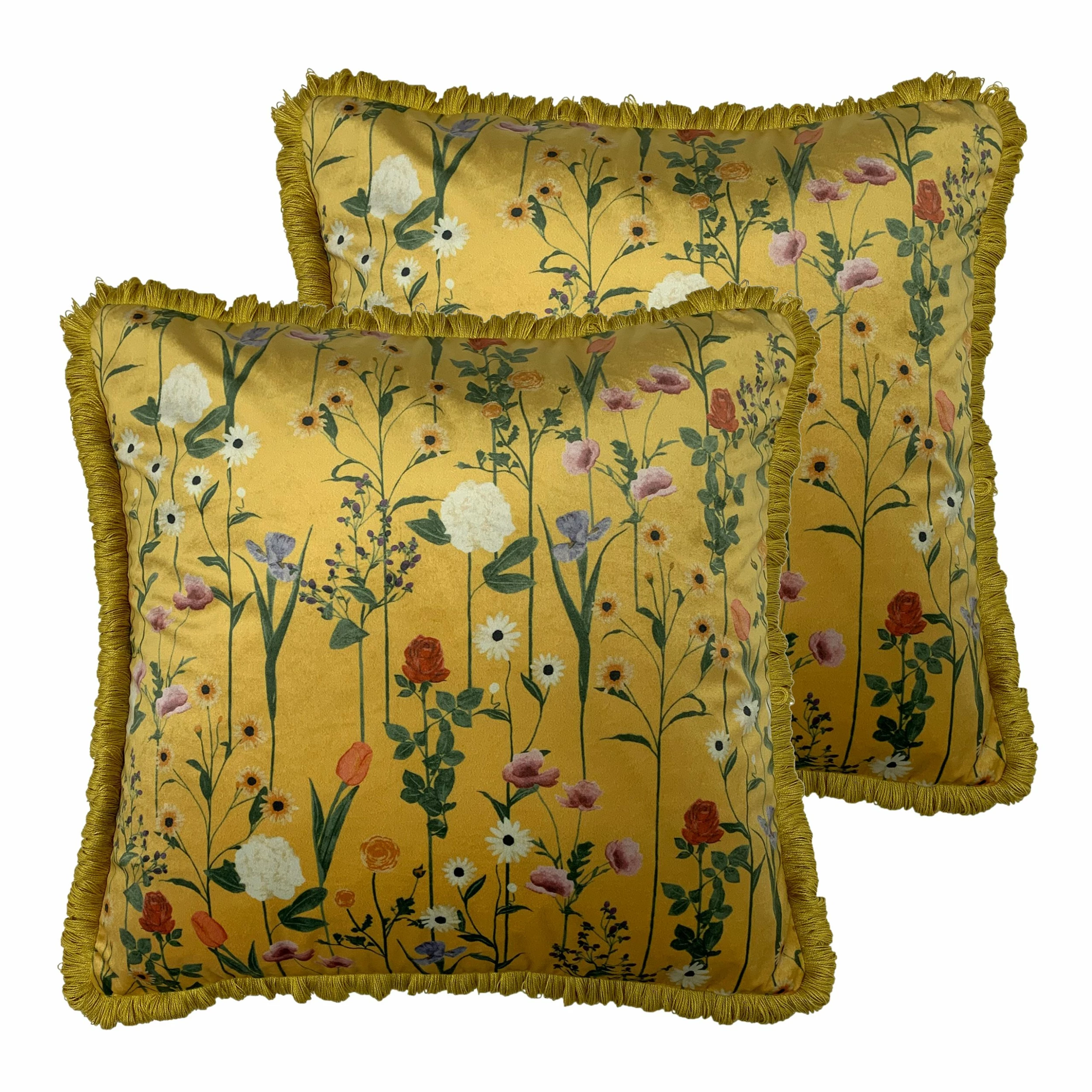 A beautiful and bold hand-painted botanical print, Fleura features delicate stems of soft petalled flowers on a plush ochre velvet. Finished with soft looped fringe trim, this cushion is an eye-catching accessory suitable for any space.