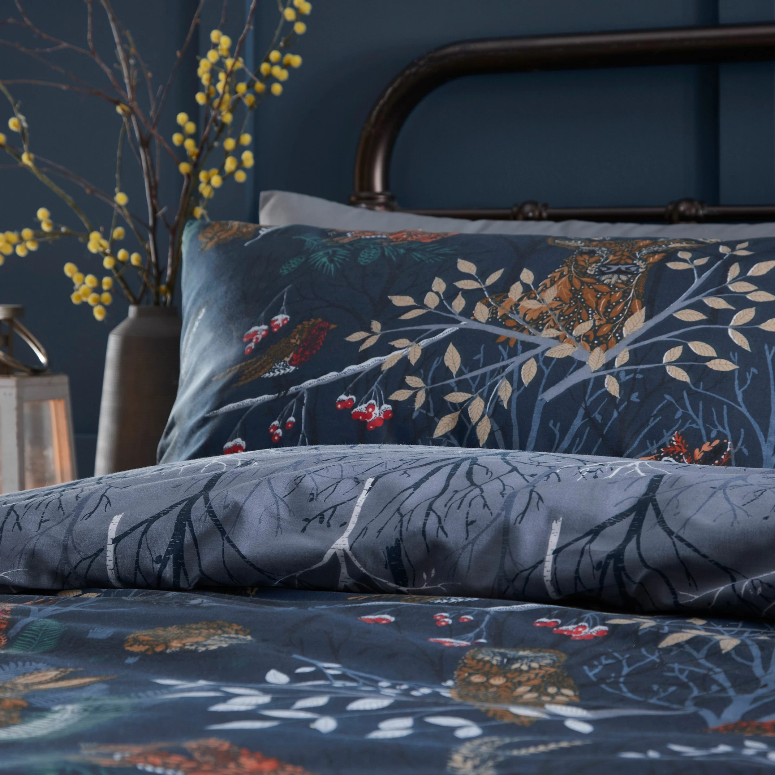 An enchanting scene, Forest Fauna is a decorative print capturing the magic of nature. The animals are at one with their surrounding, with the woodland leaves and flowers swirling and curling together to camouflage them in their habitat. Inspired by the colours of leaves throughout the year, and featuring a beautiful woodland tree design on the reverse, this is a truly captivating design.