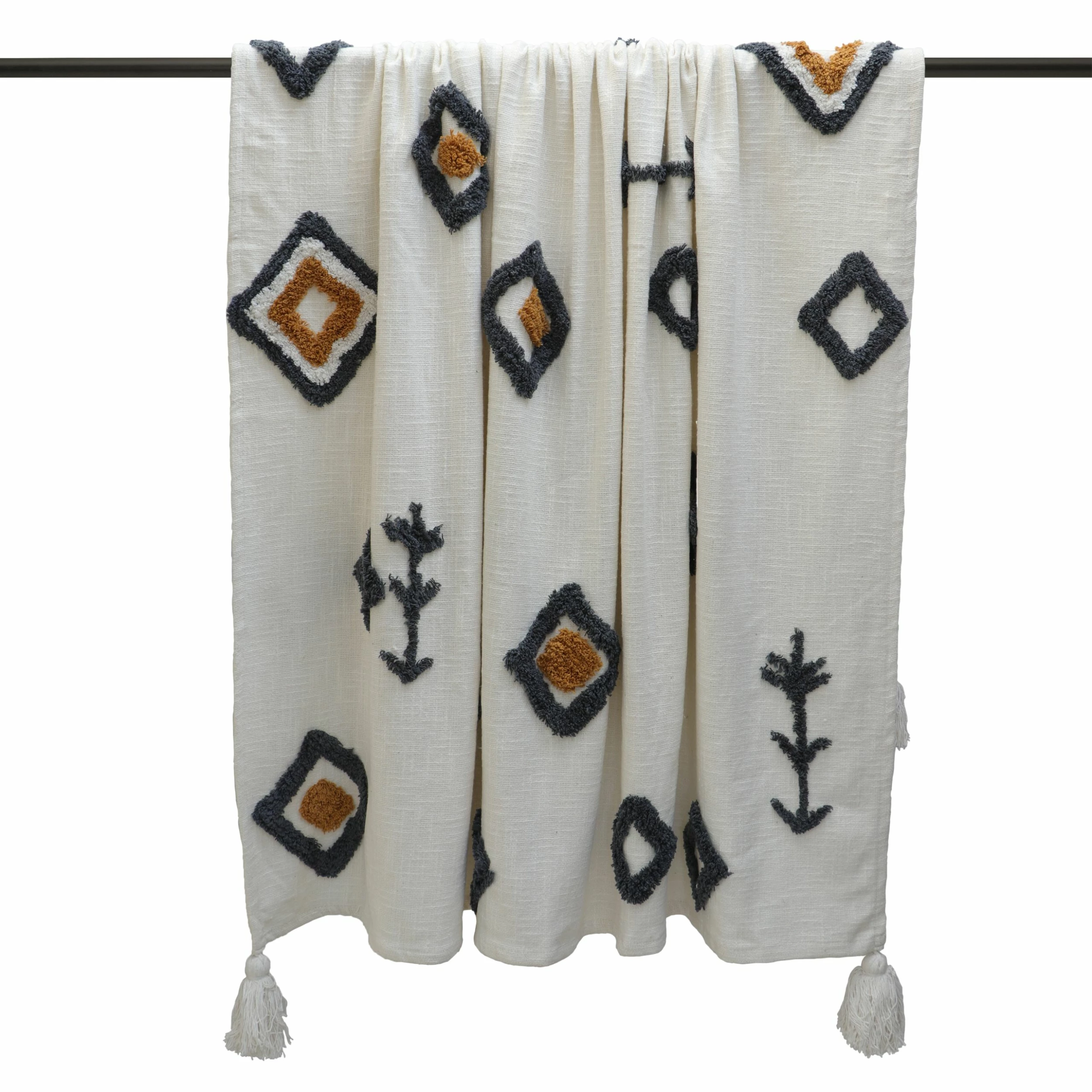 The Inka throw is a showstopping piece which is inspired by global textures and prints. Featuring tufted shapes in warm ochre and grey, on a natural base, finished with tassel corners. Hand Wash Only.