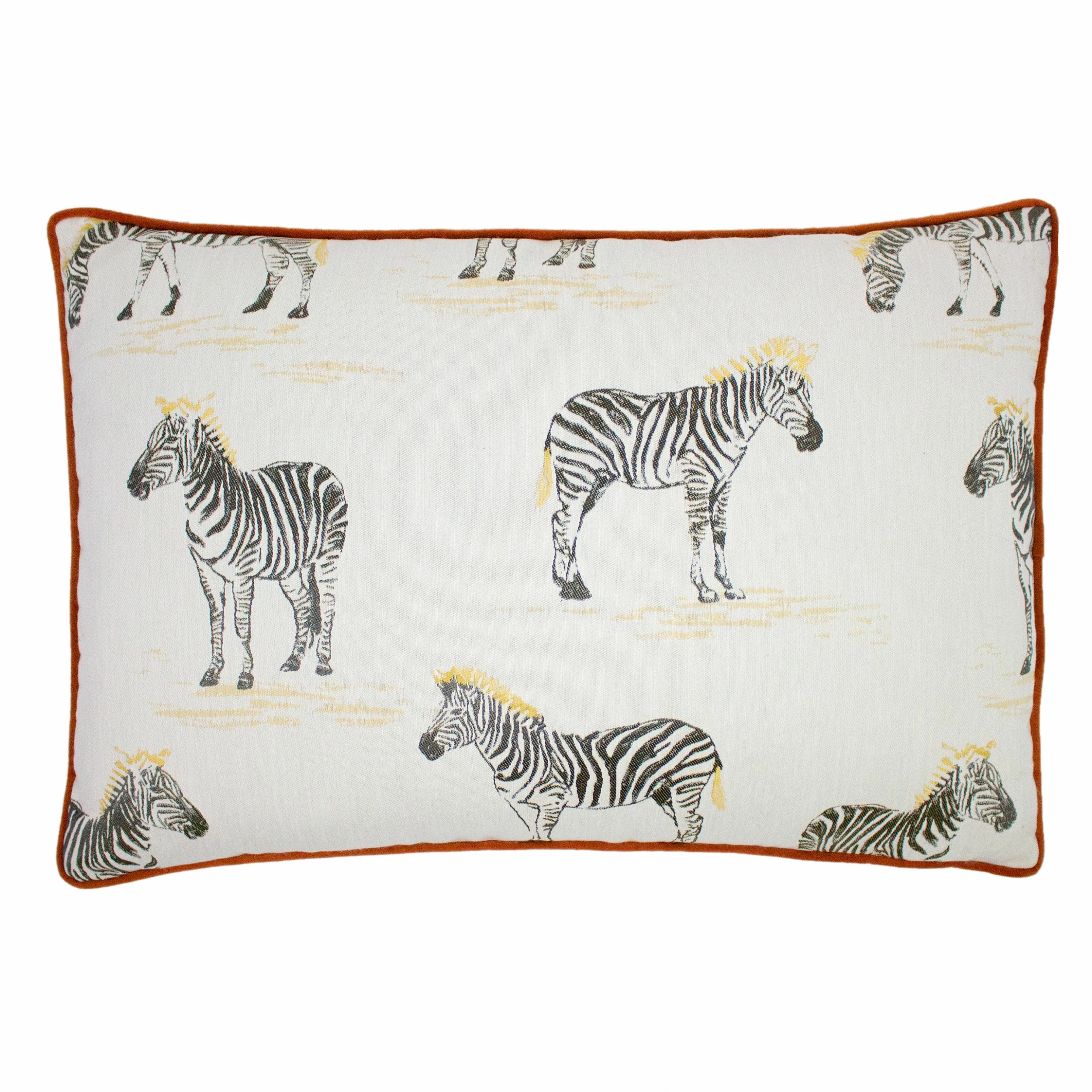 Bold and vibrant, this statement cushion featuring a repetitive design of the distinctive Zebra will be a great addition to any interior. With its rust-coloured velvet reverse and contrasting piped edges; this cushion is perfect for adding a touch of colour to your home.