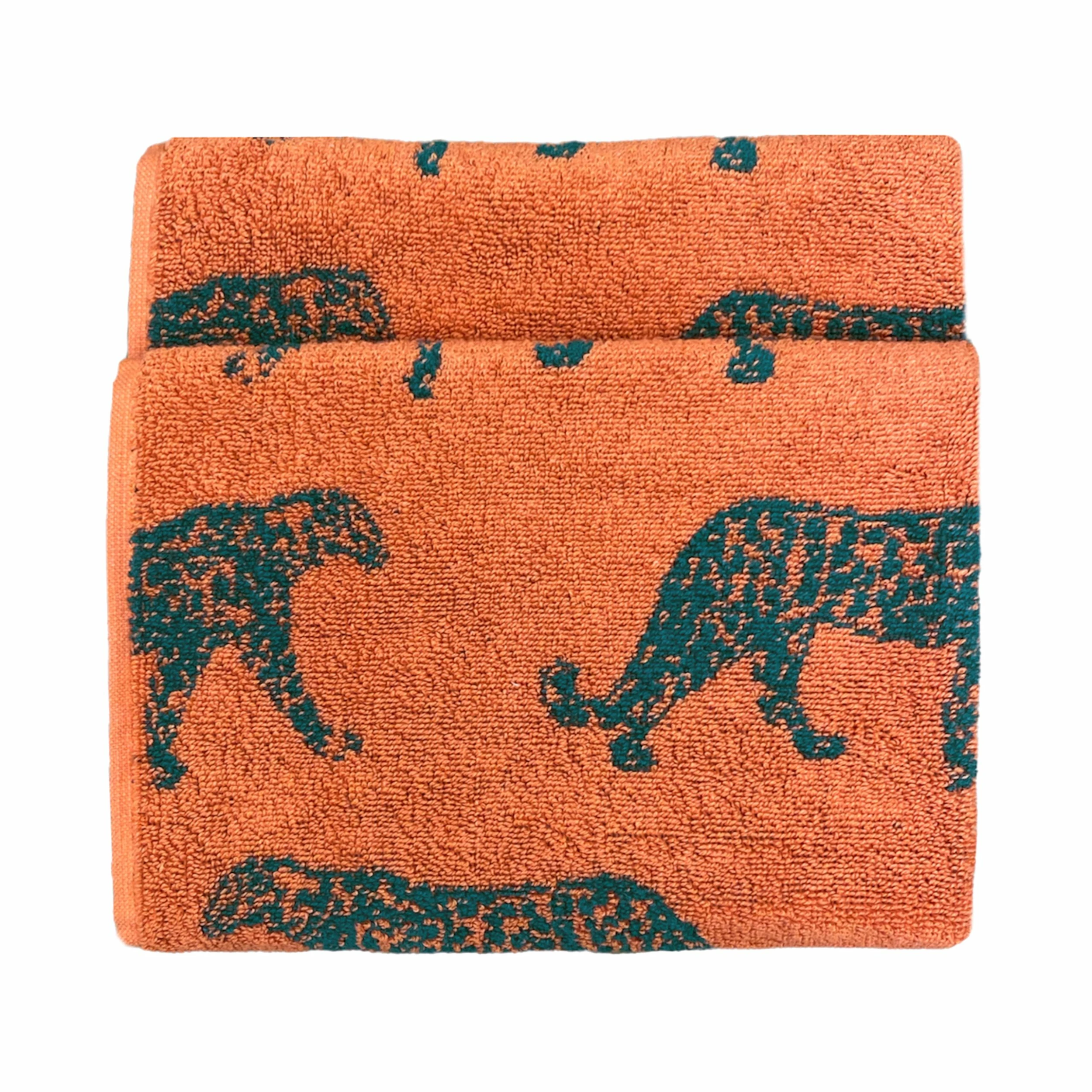 Take a walk on the wild side with this 100% Turkish cotton hand towel showcasing a repetitive print of the majestic Leopard. With its quirky colour palettes and bold hem trim – this design will certainly add that touch of colour your home is screaming for! This product is certified by OEKO-TEX® showing it has been sustainably made.
