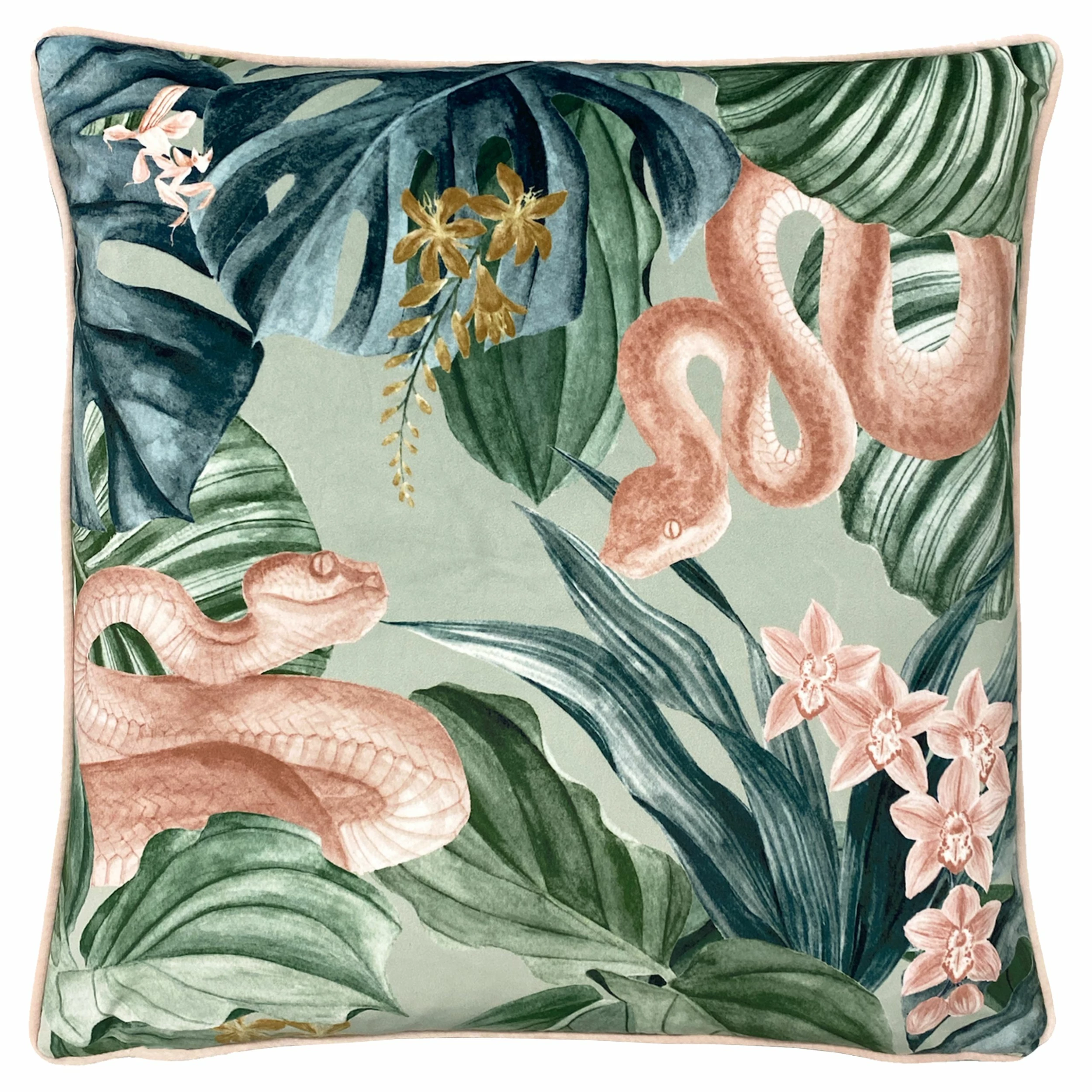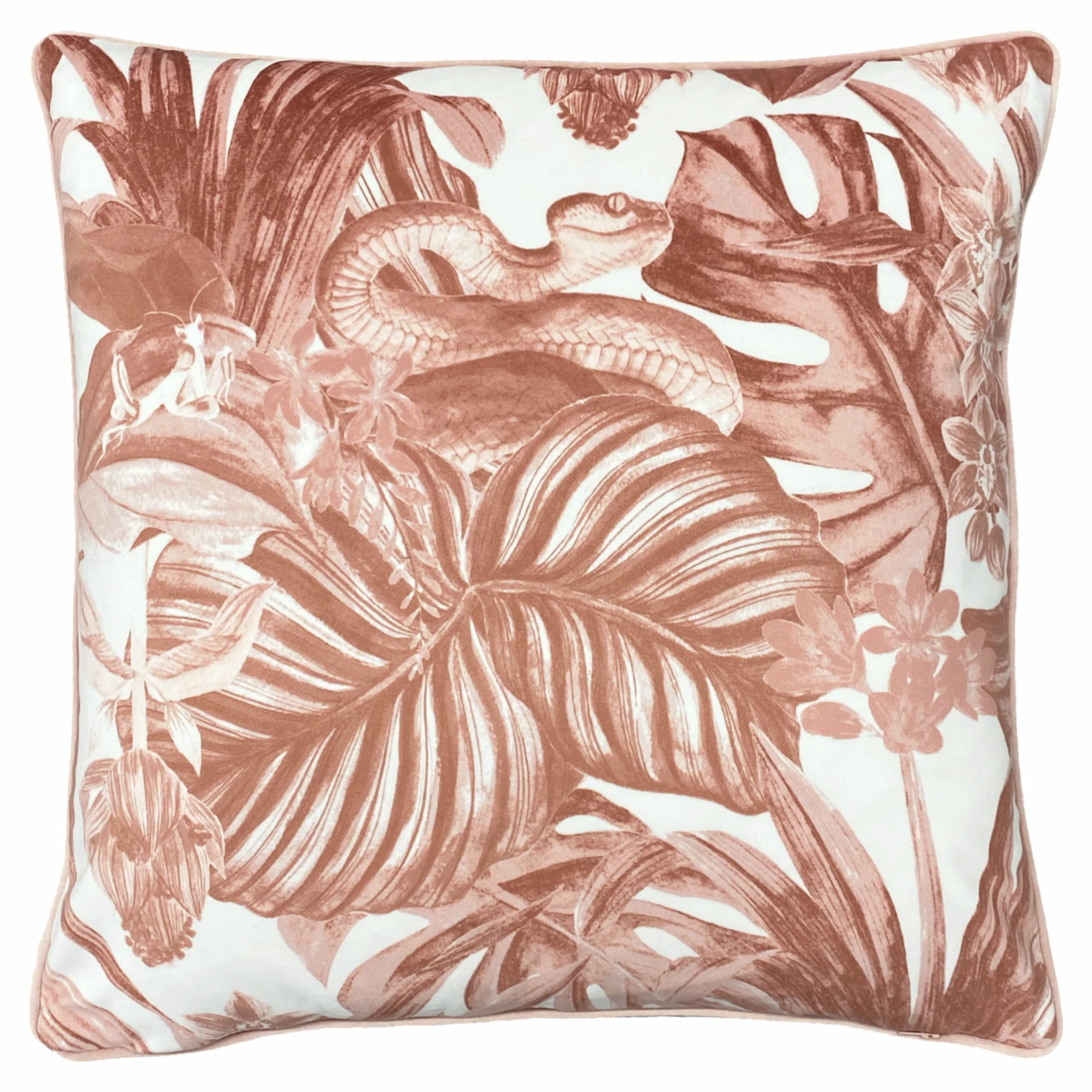 Get lost amongst the tropical floral jungle with this beautiful watercolour cushion. Delve deep amongst the tropical foliage to discover an exotic array of creatures hiding in their natural habitat, from the deadly praying mantis to an elegant pink snake. Coordinate with the Medinilla Duvet Cover Set.