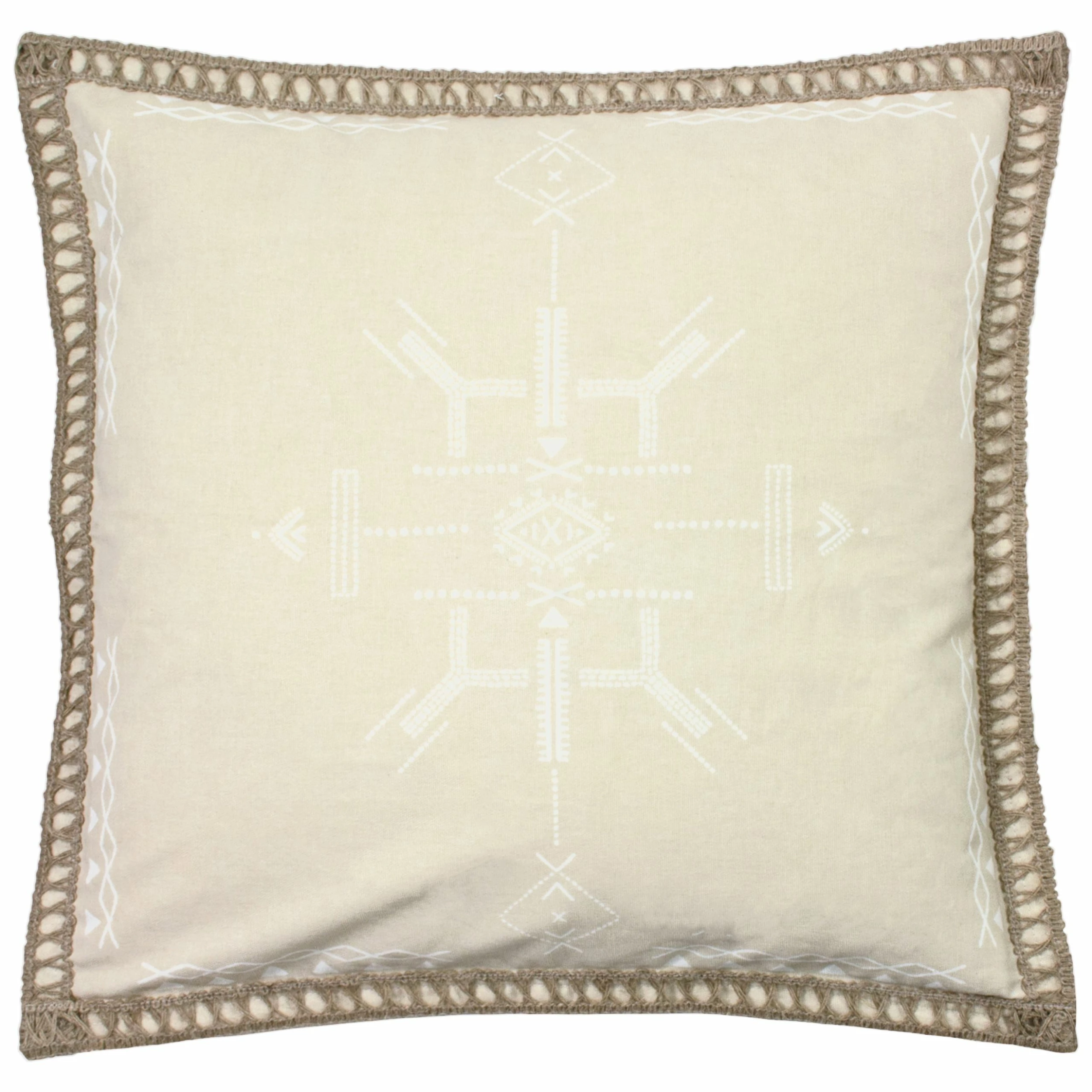Add global style and texture to your bedroom or living room with a hand drawn Aztec inspired cushion. Perfect for bohemian and minimalist styling at home, this design featuring a Jute braided trim is the perfect touch to add a visually textural statement to your interior.