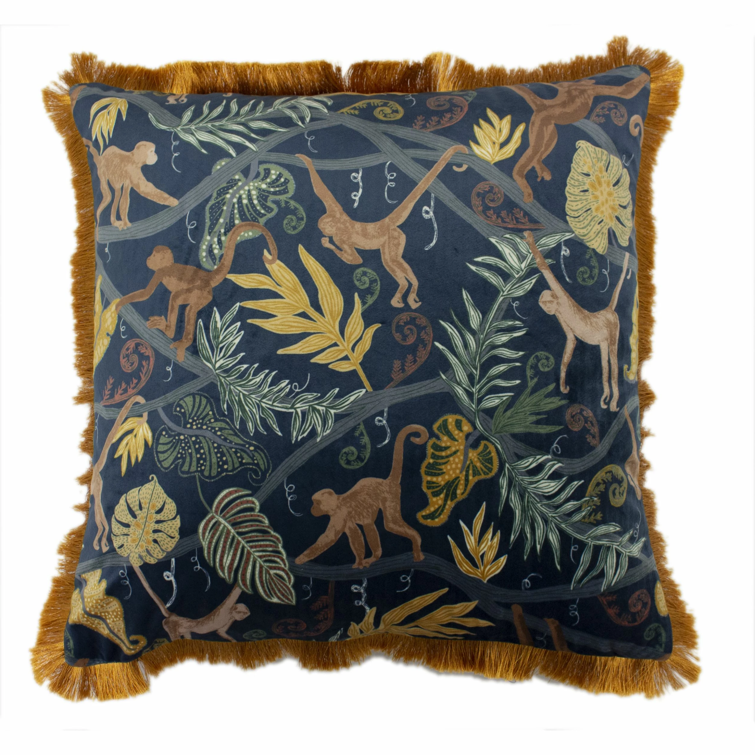 Bring “♫ I wanna be like you ♫” to life with this stylish and exotic velvet cushion. Featuring a playful, exquisite print of monkeys, vines and tropical palms – this bold cushion is an eye-catcher. The rich midnight blue background allows the funky print to stand out alongside the fringed edging. This design is certainly a showstopper and would be a great feature to any décor.