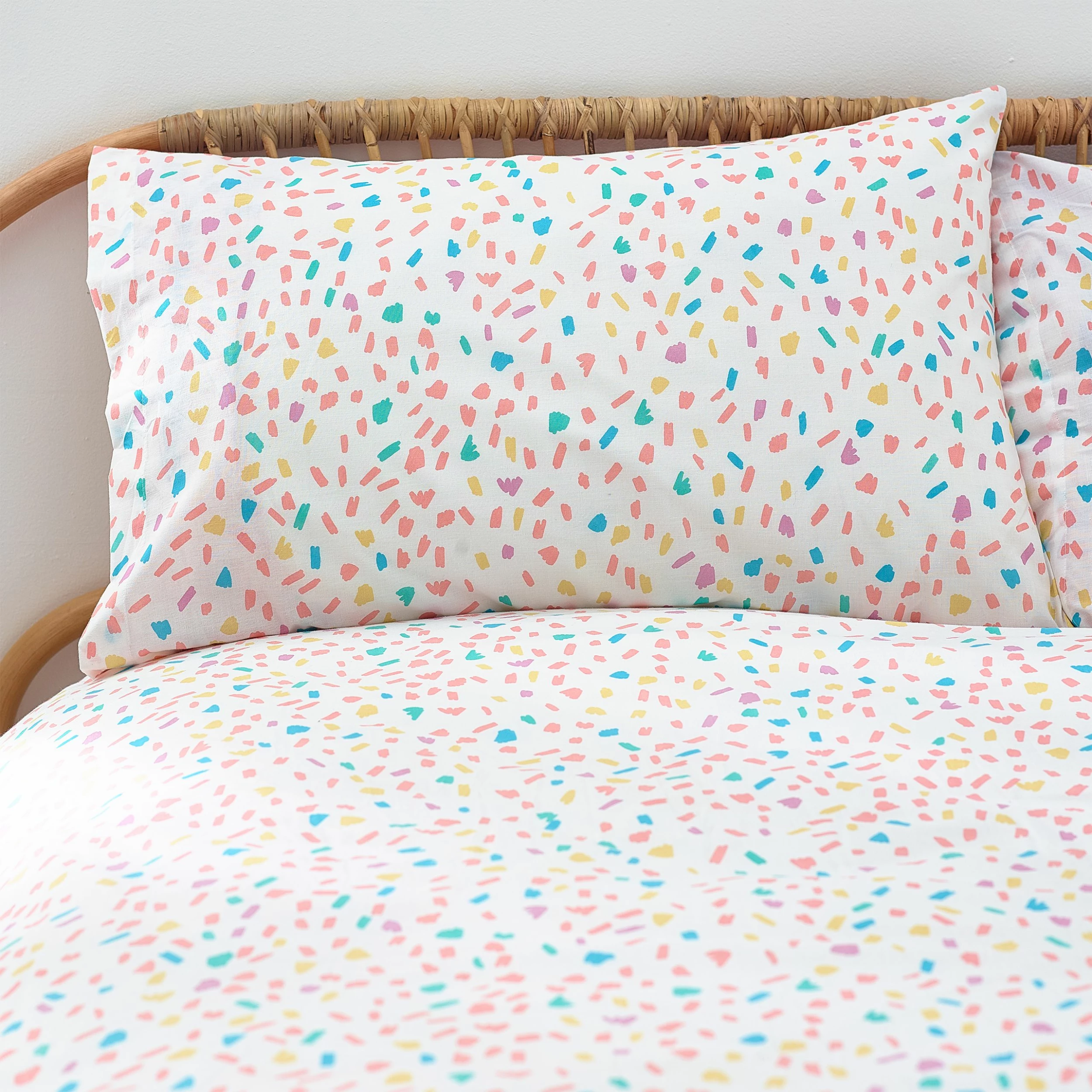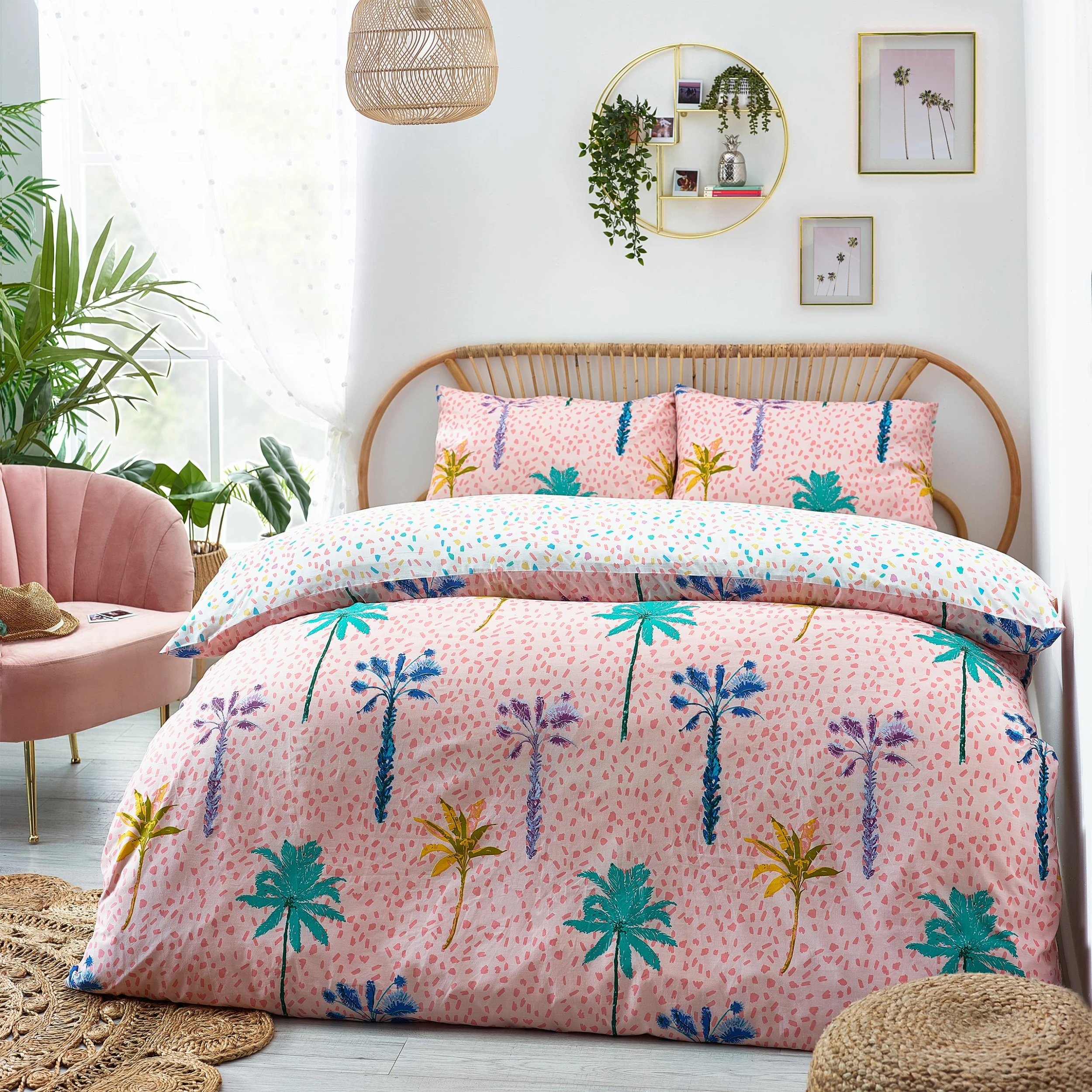 You will feel like you are on holiday with this Palmtropolis duvet set. Featuring a vibrant coloured palm tree oasis. The vibrancy continues to the reverse with a multi-coloured confetti design so you can switch the look when you need to.