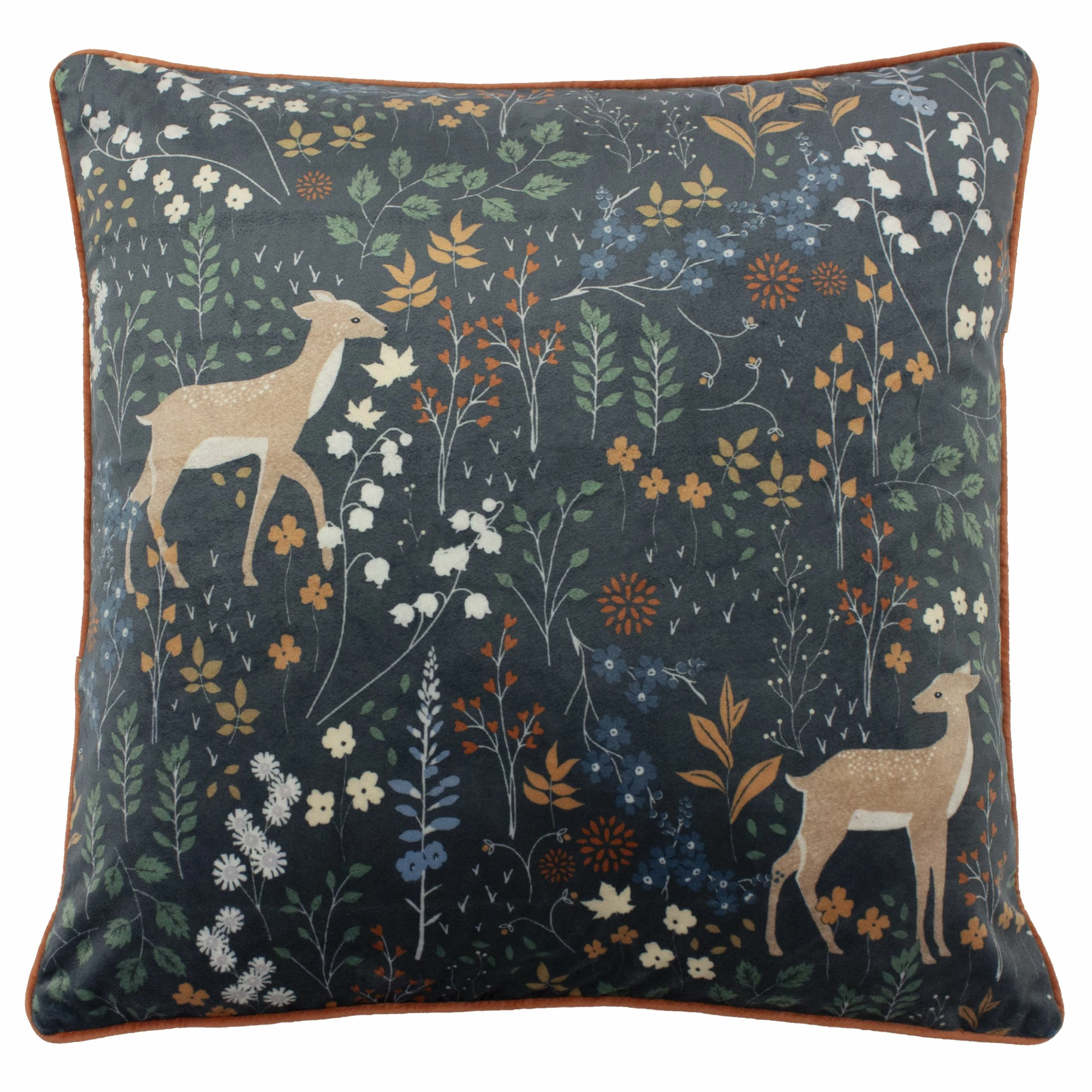 Add a natural touch to your home with this bold, yet delicately adored print which features woodland animal, a fallow deer alongside seasonal Botanics and greenery. The soft-velvet feel fabric will instantly have you grabbing this cushion to snuggle up with. Bright with a full of life print – this attractive cushion be a great feature in any room.