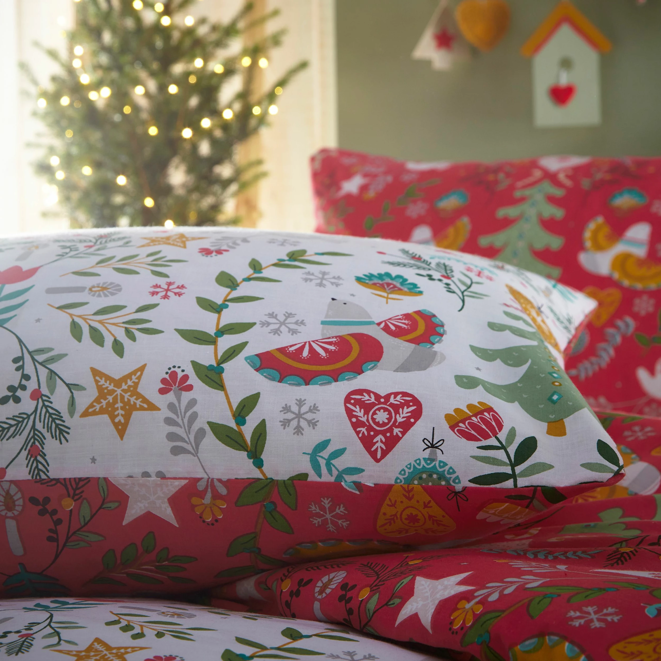 Add a fun festive touch to your home this winter with this stylish Scandinavian inspired duvet set. This design features a modern take on Scandinavian Christmas classics; wreaths made of pine leaves, rustic ornaments, and Christmas doves. Completing this fun bedding with a bold reverse.