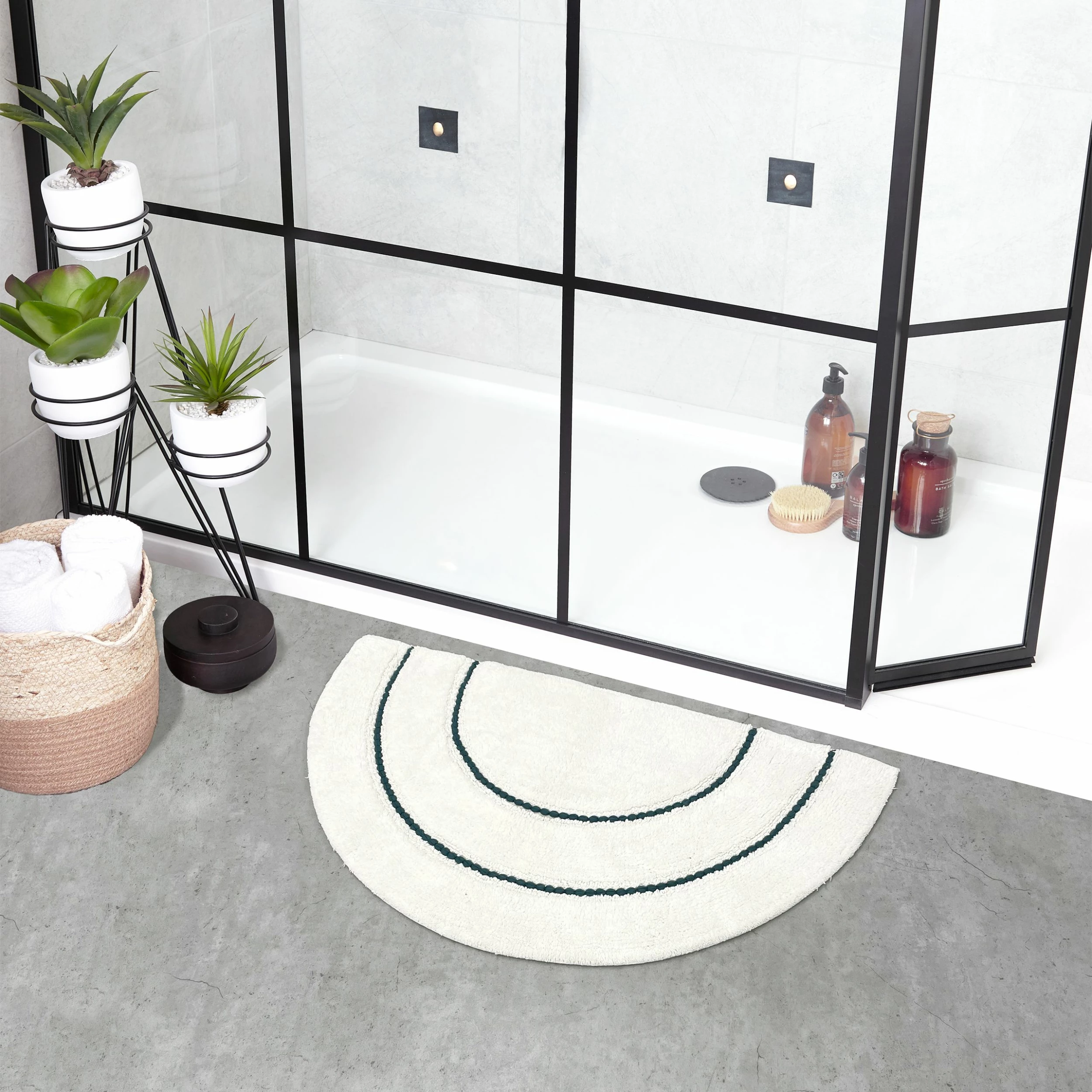 Taking inspiration from Boho interior stylings, the Semi Circle bath mat features a super-soft thick cotton base with braided colourful markings. Wonderfully soft underfoot, it’s also quick-drying and has an anti-slip quality, keeping it in place on your bathroom floor.