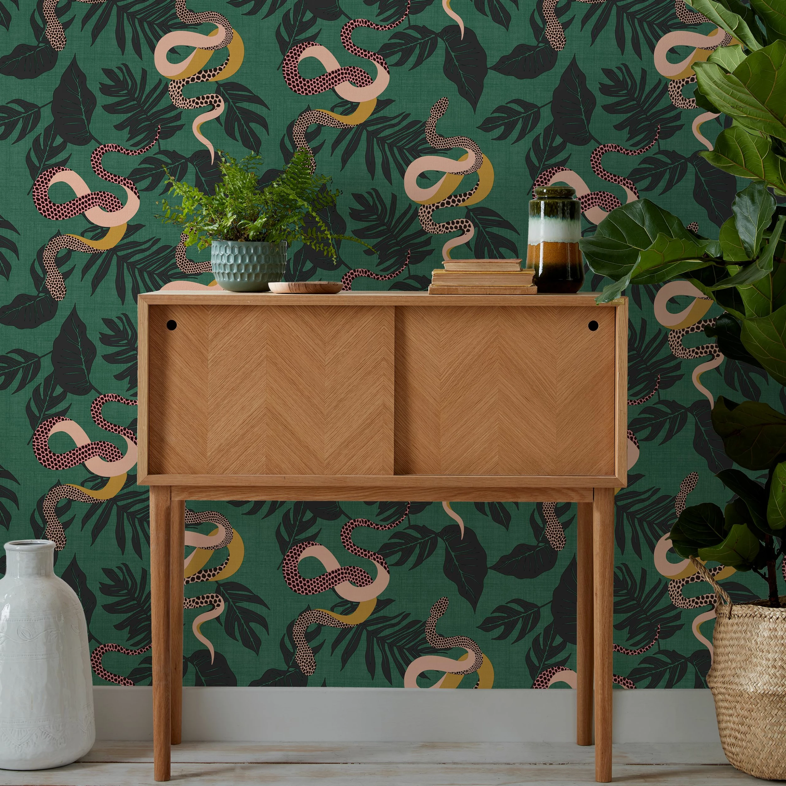 Add instant personality to your room with the Serpentine wallpaper featuring bold snakes on a tropical palm leaf background. The quirky exotic snakes lay amongst an array of wild greenery. With pops of blush pink and orange with intricate detailing, this wallpaper will make a statement. This wallpaper is a paste the wall application; simply paste the wall, hang your paper, and leave to dry. Each roll is 10m long and 52cm wide. Pattern repeat: 26.5cm Half Drop. Our Serpentine wallpaper can be used to paper the whole room or to create an eye-catching feature wall. This wallpaper is also wipeable so that any light marks can be dabbed away.