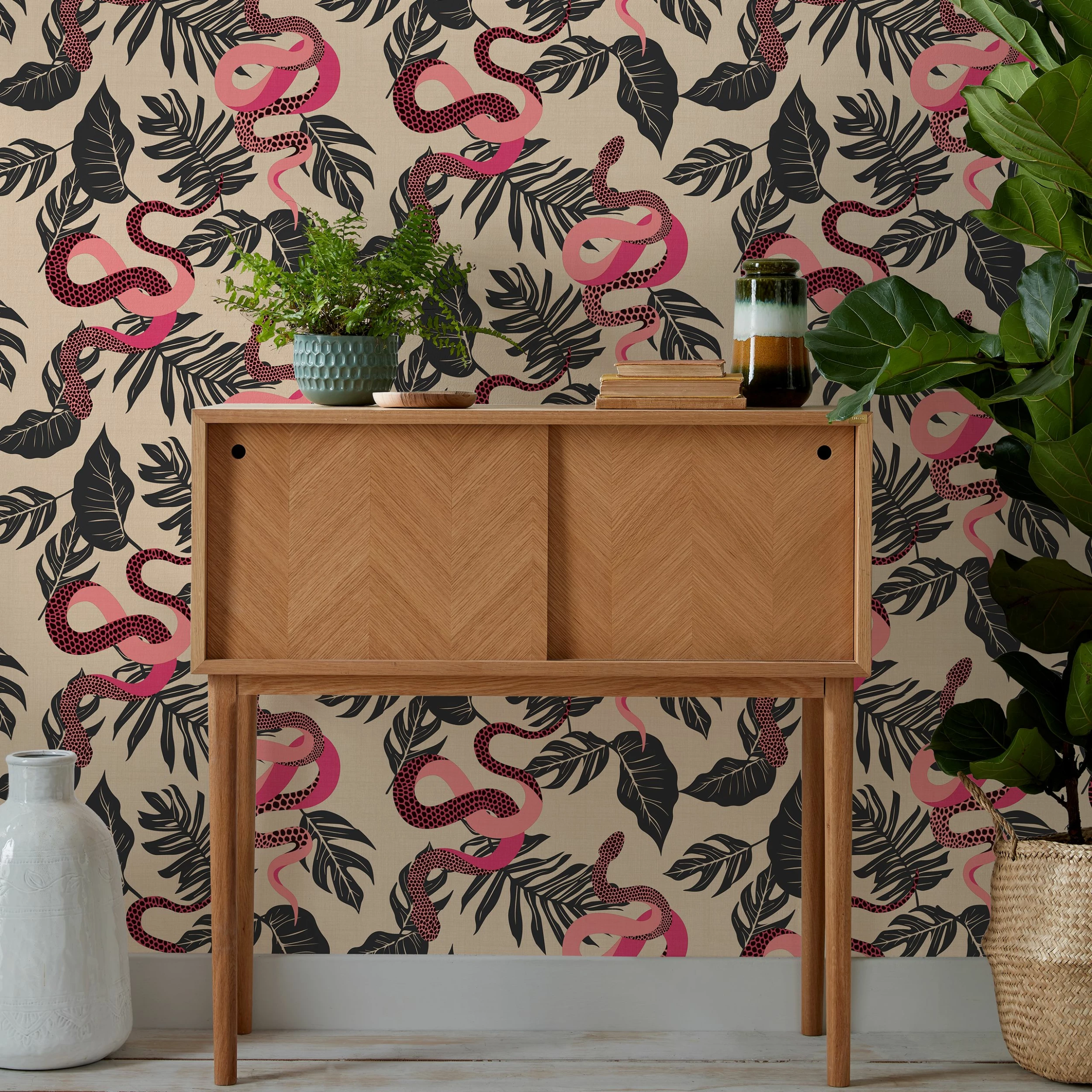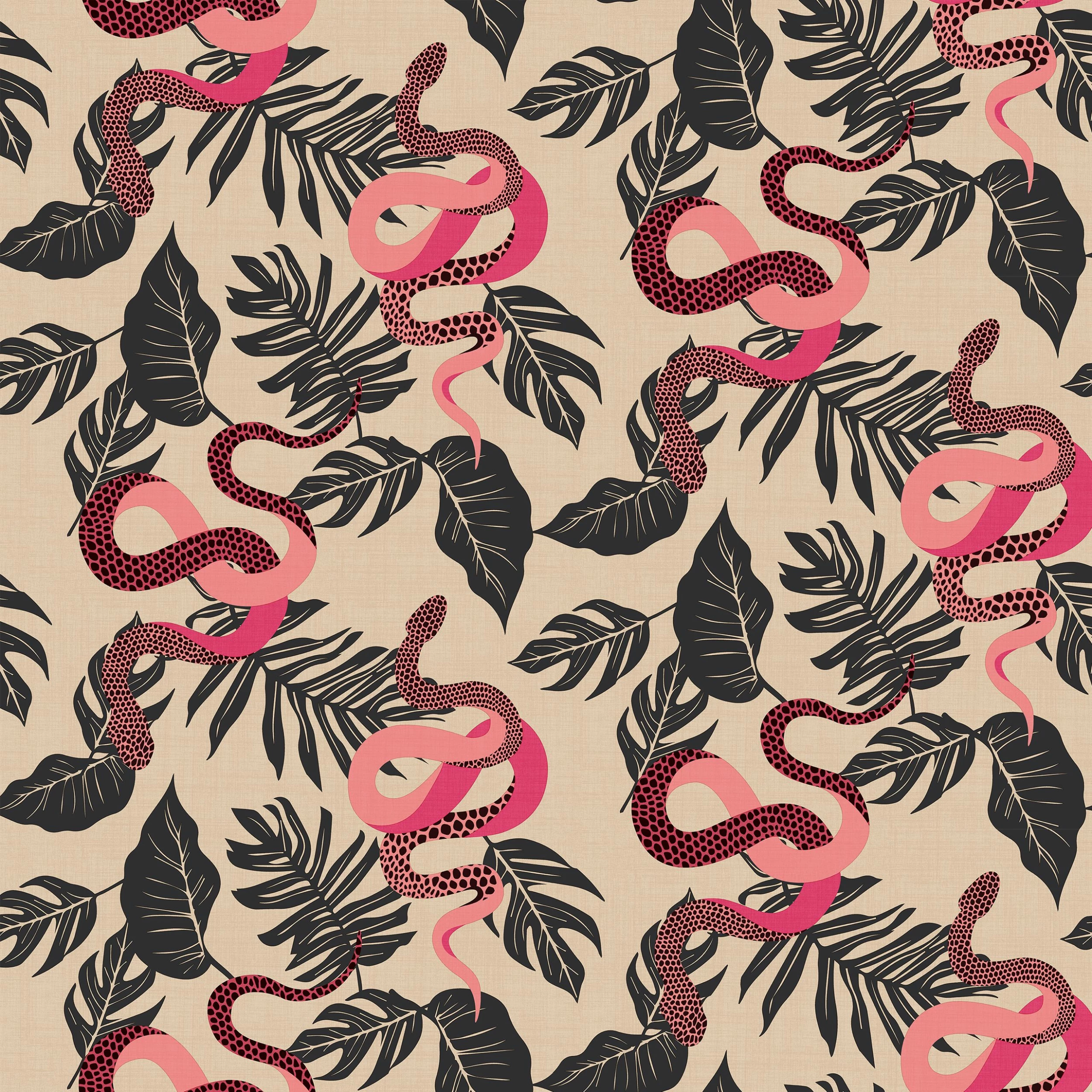Add instant personality to your room with the Serpentine wallpaper featuring bold snakes on a tropical palm leaf background. The quirky exotic snakes lay amongst an array of wild greenery. With pops of pink and intricate detailing, this wallpaper will make a statement. This wallpaper is a paste the wall application; simply paste the wall, hang your paper, and leave to dry. Each roll is 10m long and 52cm wide. Pattern repeat: 26.5cm Half Drop. Our Serpentine wallpaper can be used to paper the whole room or to create an eye-catching feature wall. This wallpaper is also wipeable so that any light marks can be dabbed away.
