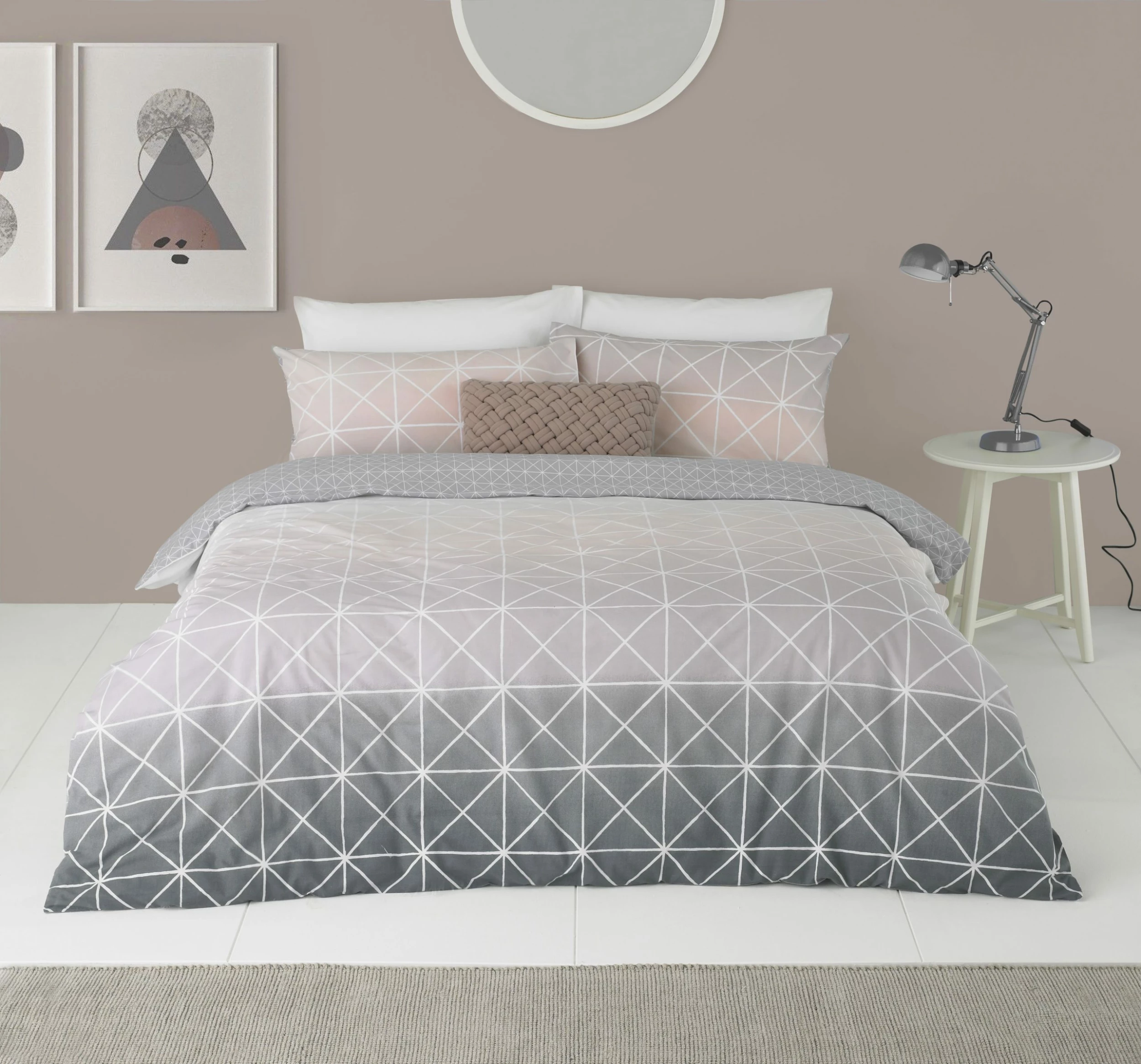 Featuring a gorgeous gradient flowing from a crisp white, to soft pink and finishing on a beautiful grey the Spectrum duvet cover set is a versatile piece. Complete with thin white lines in a geometric pattern it brings a modern touch that will elevate your bedroom into a contemporary space. The reverse has a matching plain grey with white dots to neutralise the statement front. Each duvet set comes with matching pillowcases with a reversible design. Made of crisp polycotton making this duvet set soft and hard-wearing. This duvet cover features a secure button closure while the pillowcases have an envelope closure. Machine washable on a 40 degree cycle. Iron cool and tumble dry on a low setting for the best finish.