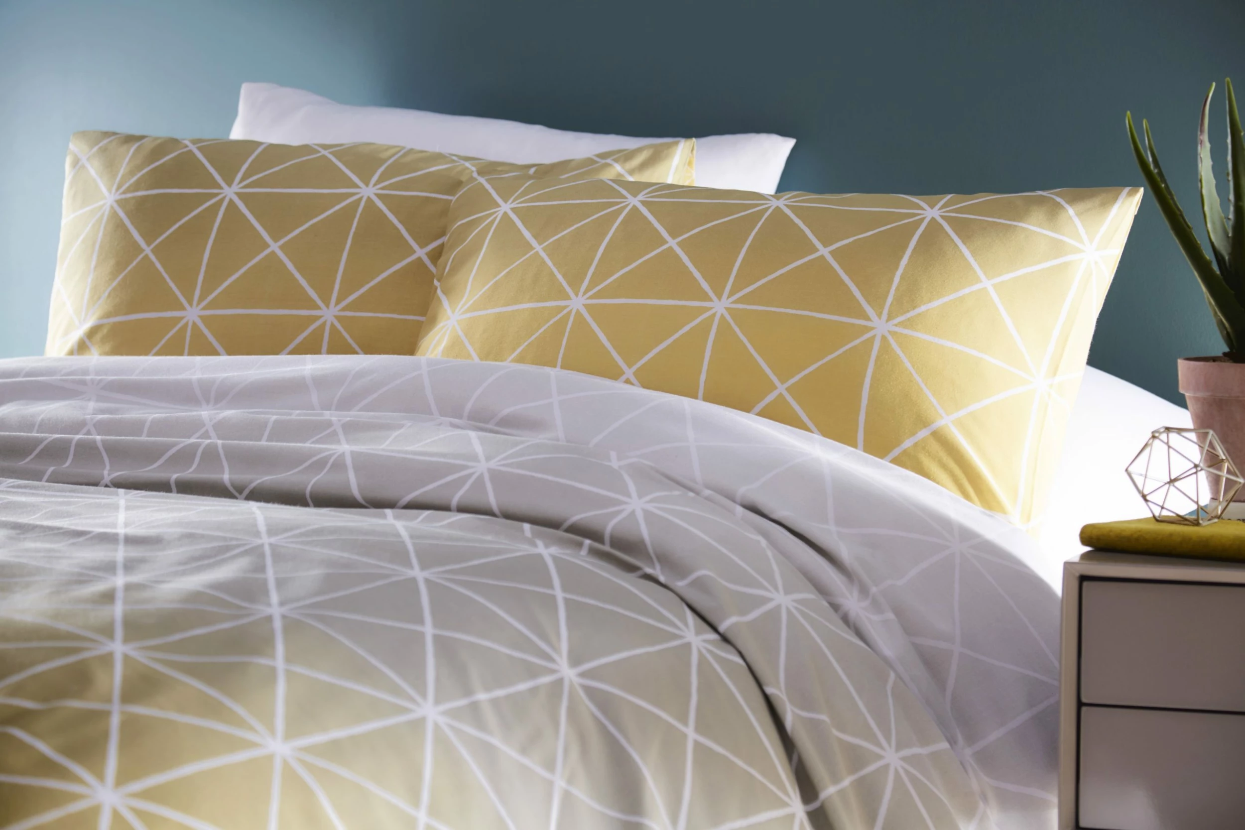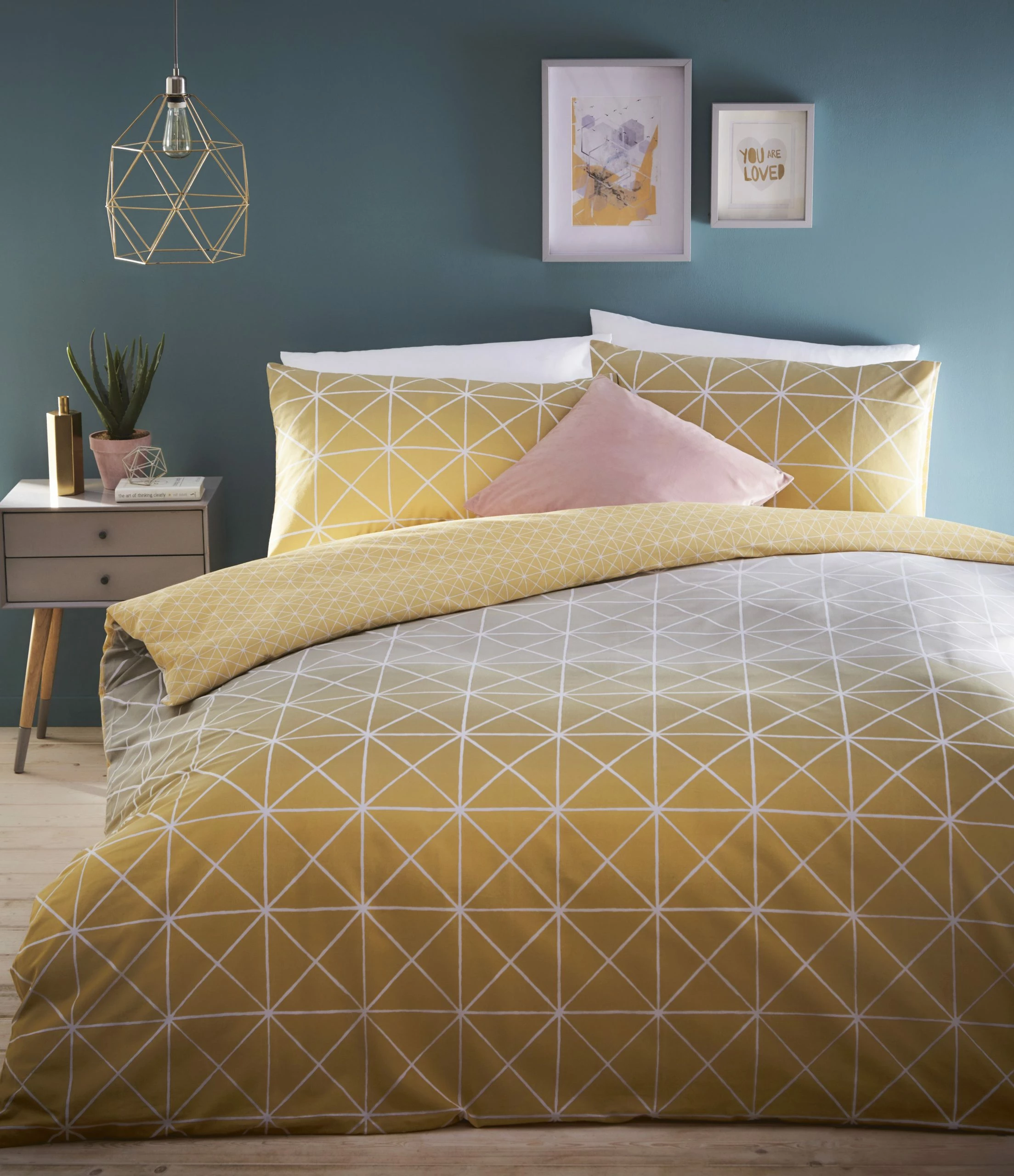 Featuring a gorgeous gradient flowing from a crisp white, to Dove Grey and finishing on a beautiful Ochre the Spectrum duvet cover set is a versatile piece. Complete with thin white lines in a geometric pattern it brings a modern touch that will elevate your bedroom into a contemporary space. The reverse has a matching plain Ochre with white dots to neutralise the statement front. Each duvet set comes with matching pillowcases with a reversible design. Made of crisp polycotton making this duvet set soft and hard-wearing. This duvet cover features a secure button closure while the pillowcases have an envelope closure. Machine washable on a 40 degree cycle. Iron cool and tumble dry on a low setting for the best finish.