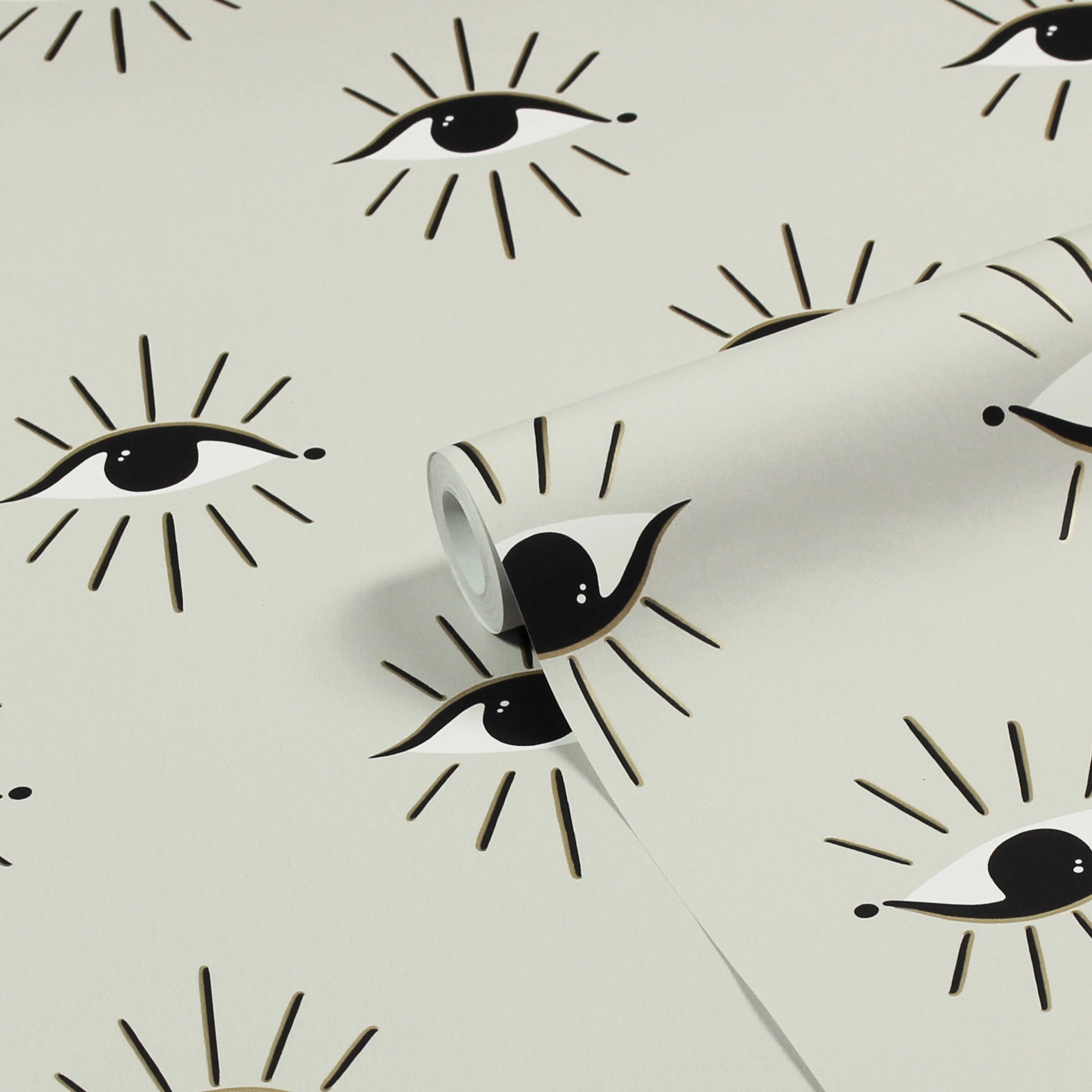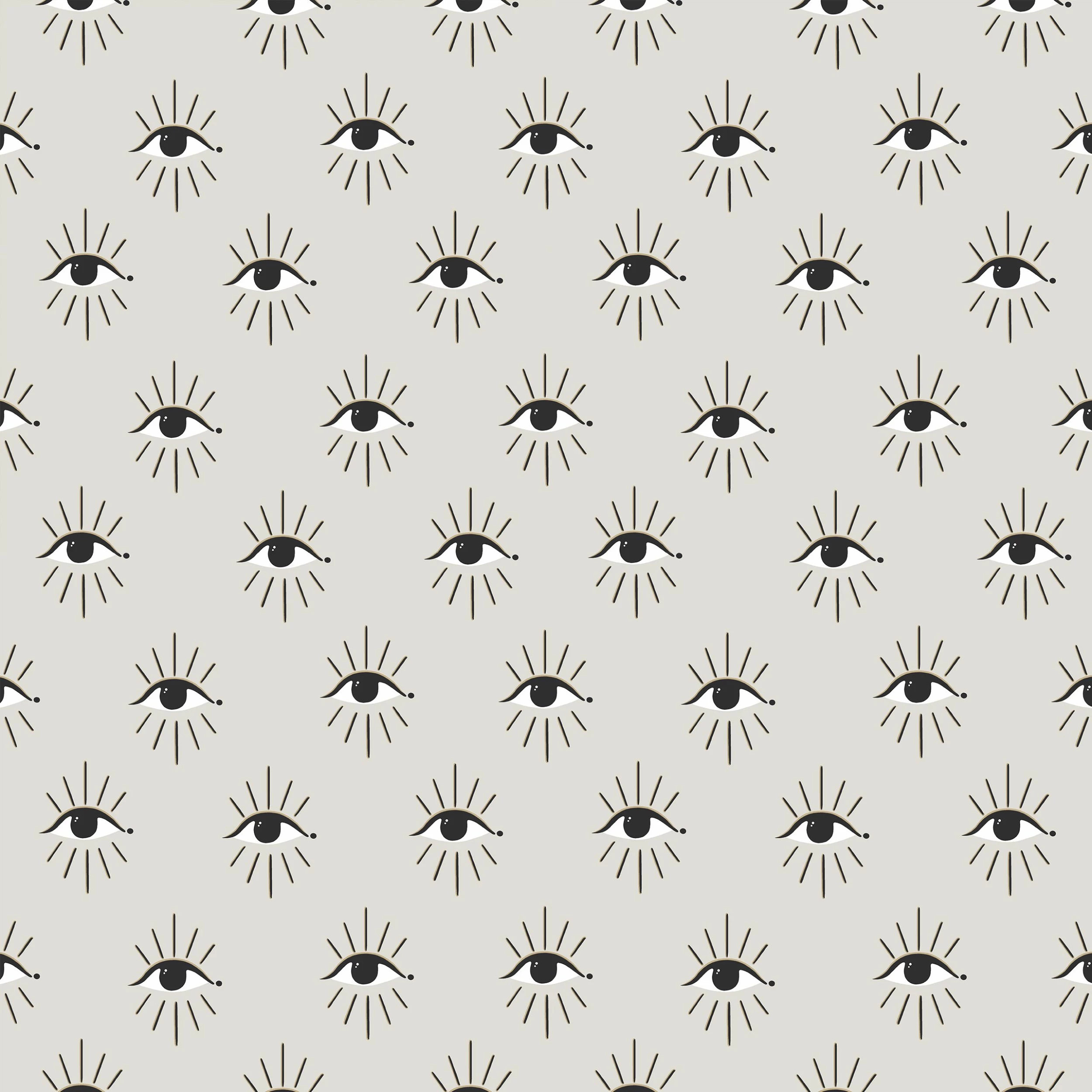 Add instant personality to your room with the Theia wallpaper featuring gold foil mystical watching eyes. This striking design will add a youthful energy to any room you choose to use it in. A soft grey hue sits behind the design, bringing a modern calming colour scheme into your home. This wallpaper is a paste the wall application; simply paste the wall, hang your paper, and leave to dry. Each roll is 10m long and 52cm wide. Pattern repeat: 53cm Straight Match. Our Theia wallpaper can be used to paper the whole room or to create an eye-catching feature wall. This wallpaper is also wipeable so that any light marks can be dabbed away.