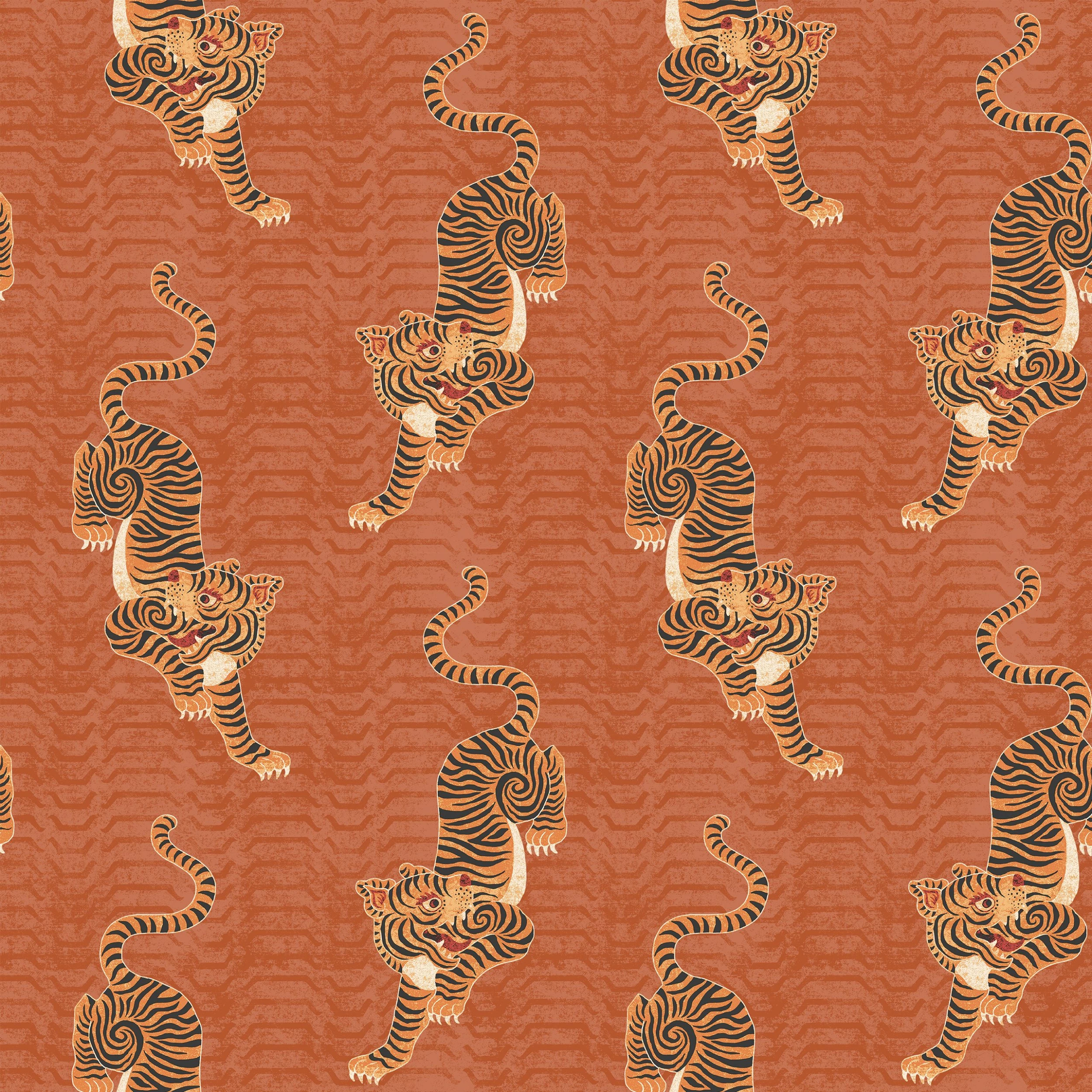 Add instant personality into your home with this showstopping Tibetan Tiger wallpaper featuring a tribal-inspired design and crawling tigers. The striking orange tiger contrasts on a bold coral backdrop, adding dimension and flair to this beautiful wallpaper. This wallpaper is a paste the wall application; simply paste the wall, hang your paper, and leave to dry. Each roll is 10m long and 52cm wide. Pattern repeat: 53cm Straight Match. Our Tibetan Tiger wallpaper can be used to paper the whole room or to create an eye-catching feature wall. This wallpaper is also wipeable so that any light marks can be dabbed away.