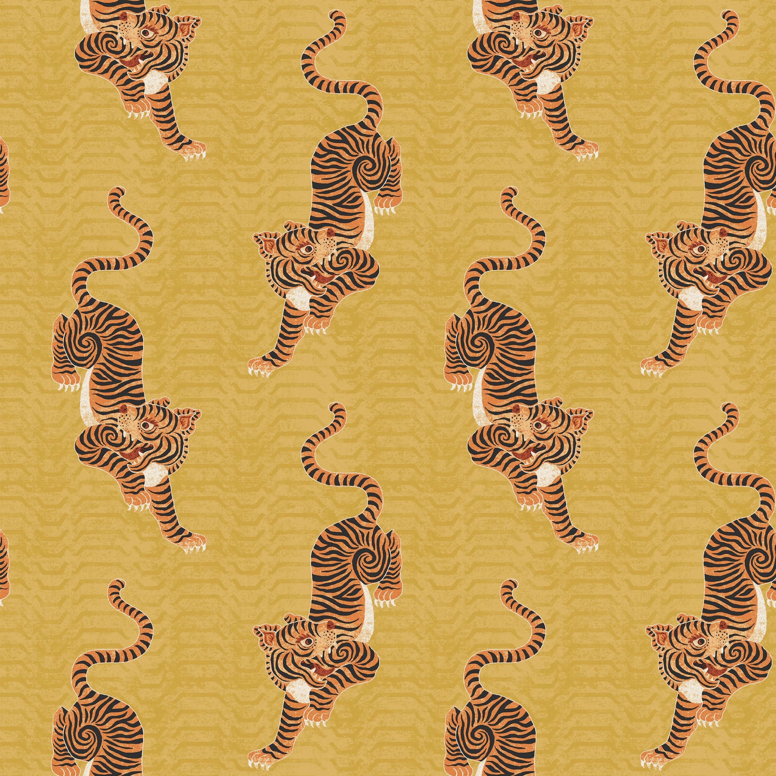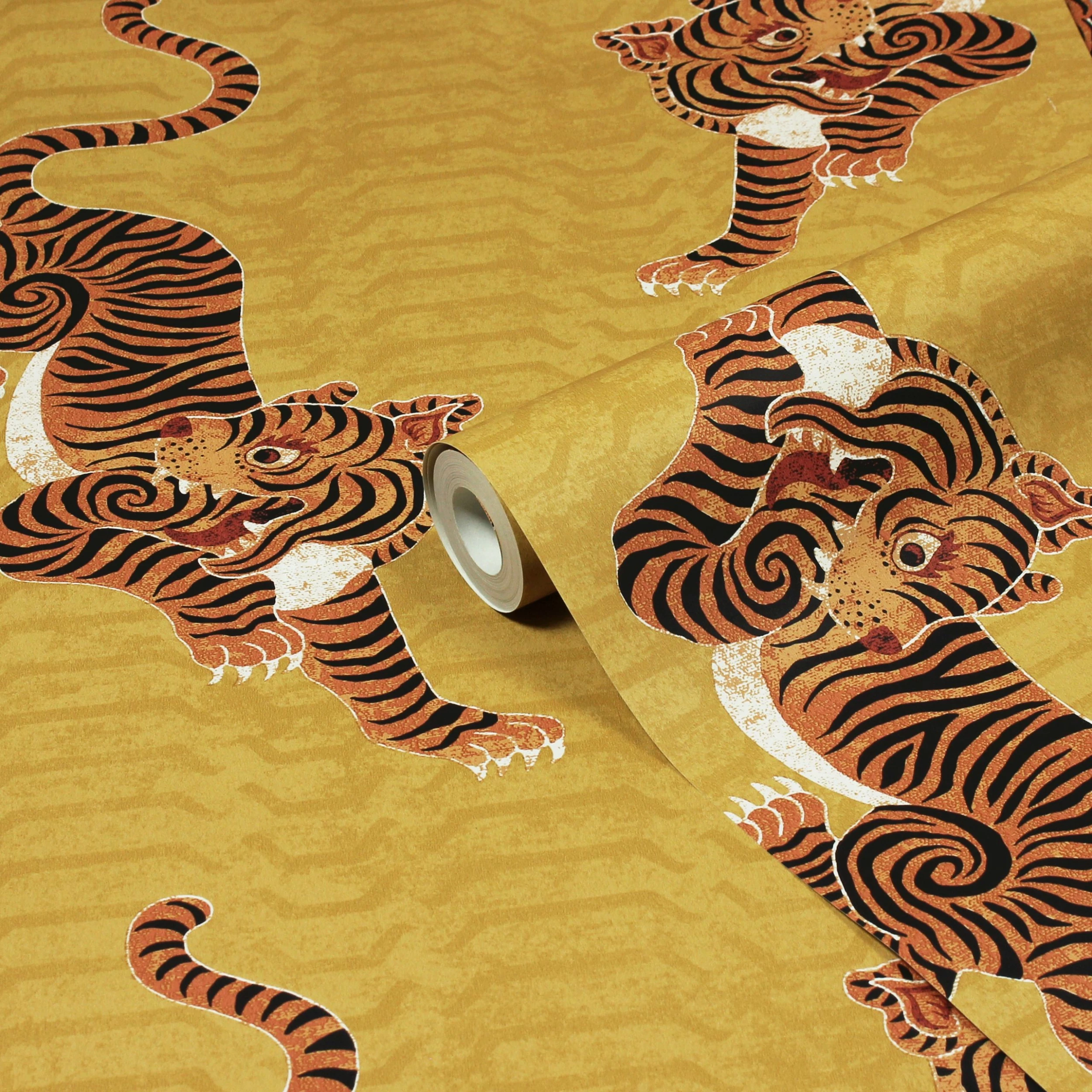 Add instant personality into your home with this showstopping Tibetan Tiger wallpaper featuring a tribal-inspired design and crawling tigers. The striking orange tiger contrasts on a bold mustard backdrop, adding dimension and flair to this beautiful wallpaper. This wallpaper is a paste the wall application; simply paste the wall, hang your paper, and leave to dry. Each roll is 10m long and 52cm wide. Pattern repeat: 53cm Straight Match. Our Tibetan Tiger wallpaper can be used to paper the whole room or to create an eye-catching feature wall. This wallpaper is also wipeable so that any light marks can be dabbed away.