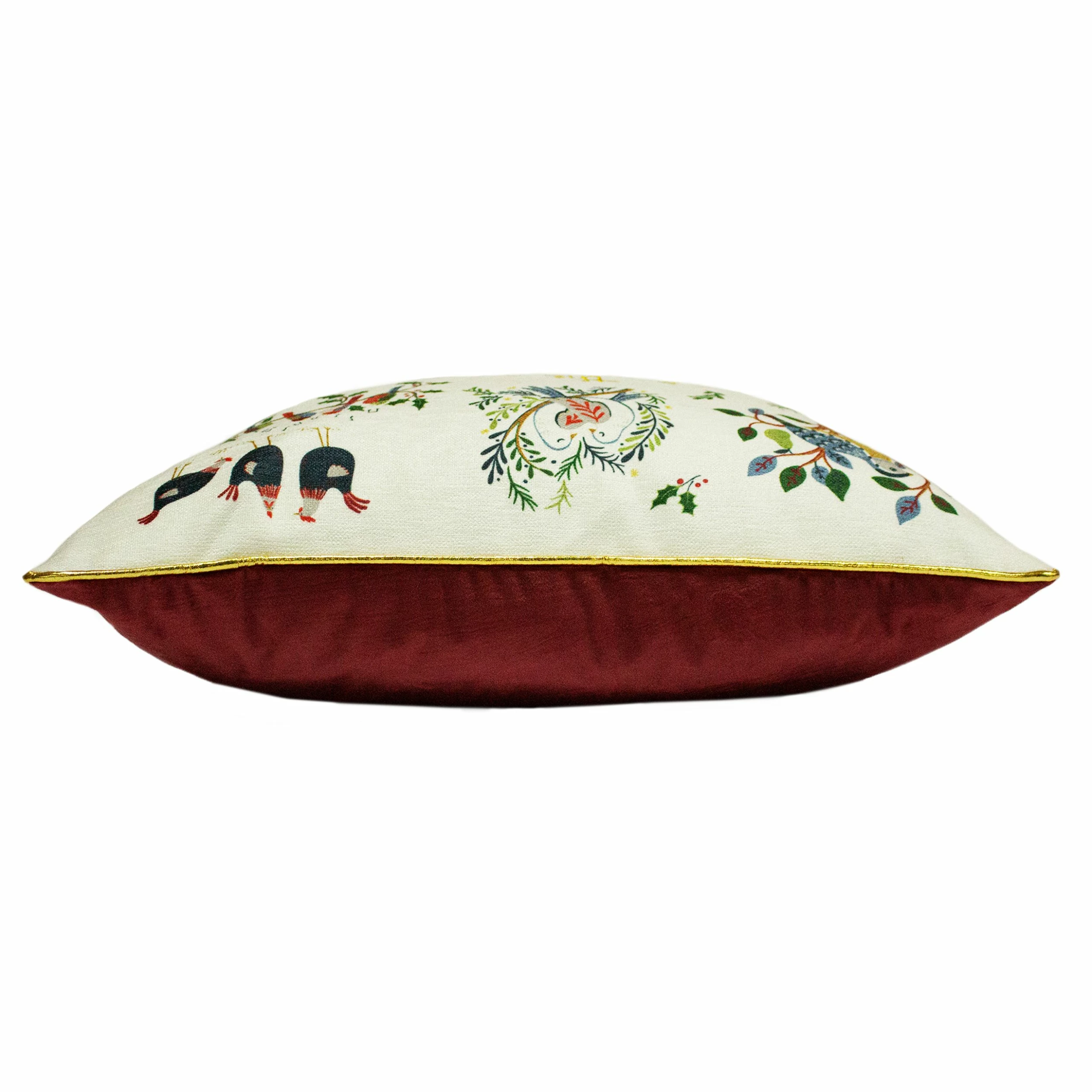 In celebration of the traditional Christmas song, our 12 days of Christmas cushion is a festive feast for the eyes, depicting each of the gifts for a magical touch. The reverse design features a soft faux-velvet and is complete with contrasting gold foiled piped edging – perfect for that extra sparkling touch!
