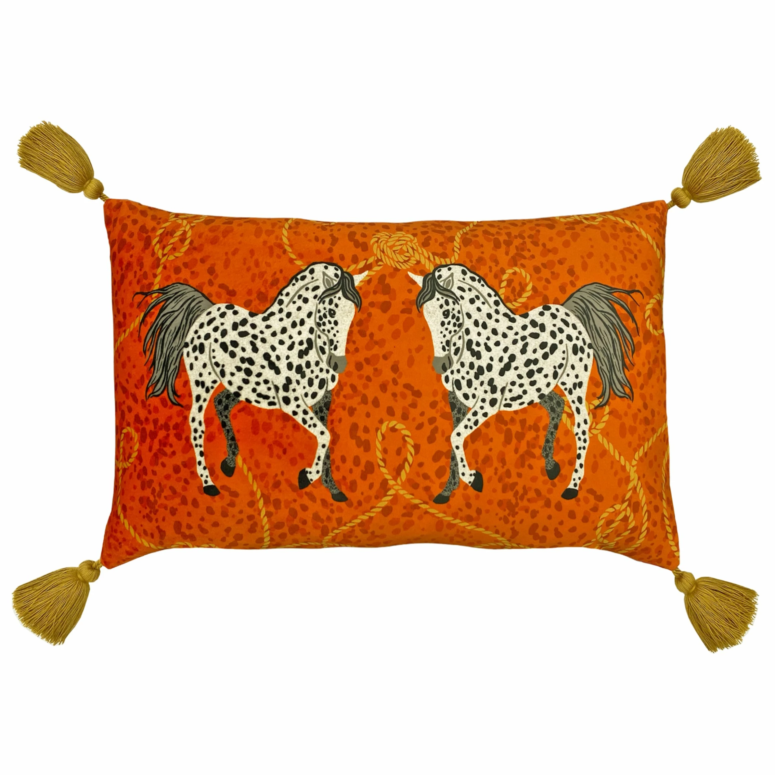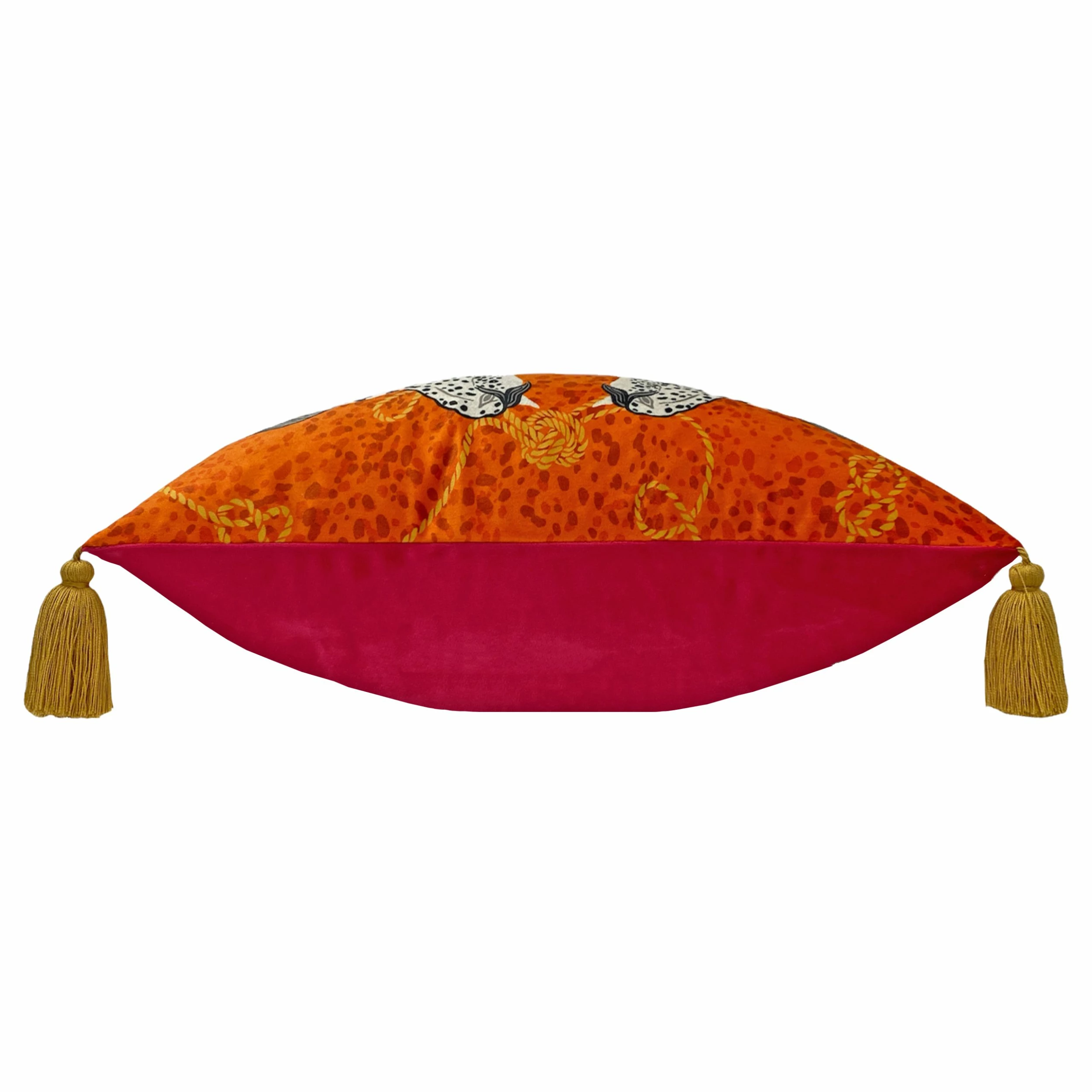 Inspired by the classic Hermes scarf, this colourful cushion is not only striking and fashionable, it is also a fantastic centre piece for any room, sure to give any scheme a new lease of life. The tones of orange and pinks, finished off with a luxe gold rope. Coordinate with the Vivid Andalucian Duvet Cover Set.
