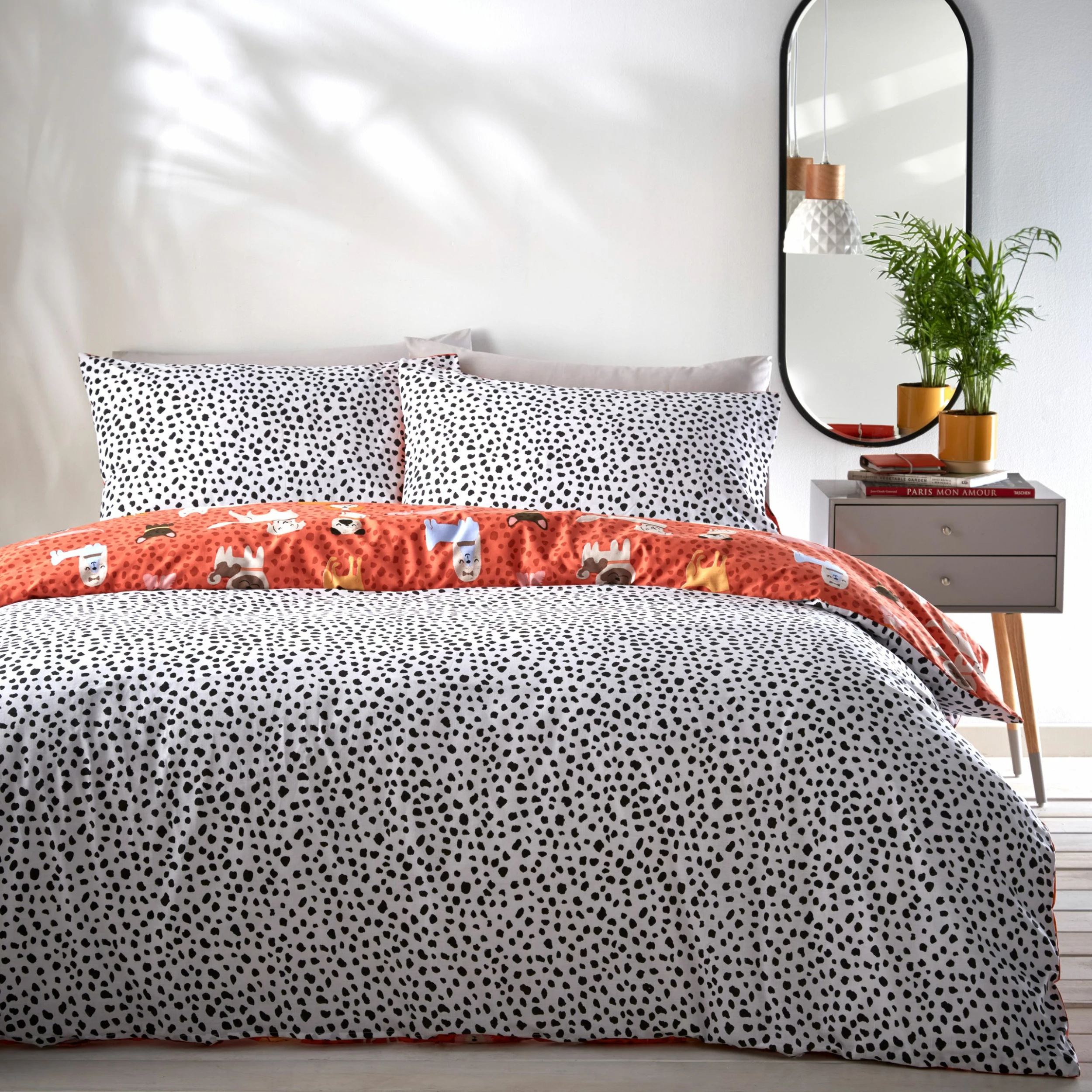 This fun, playful duvet cover and pillow case set celebrates our canine friends in all their glory, a rainbow of pooches scattered over a tonal Dalmatian spot, which adorns the reverse.